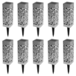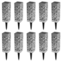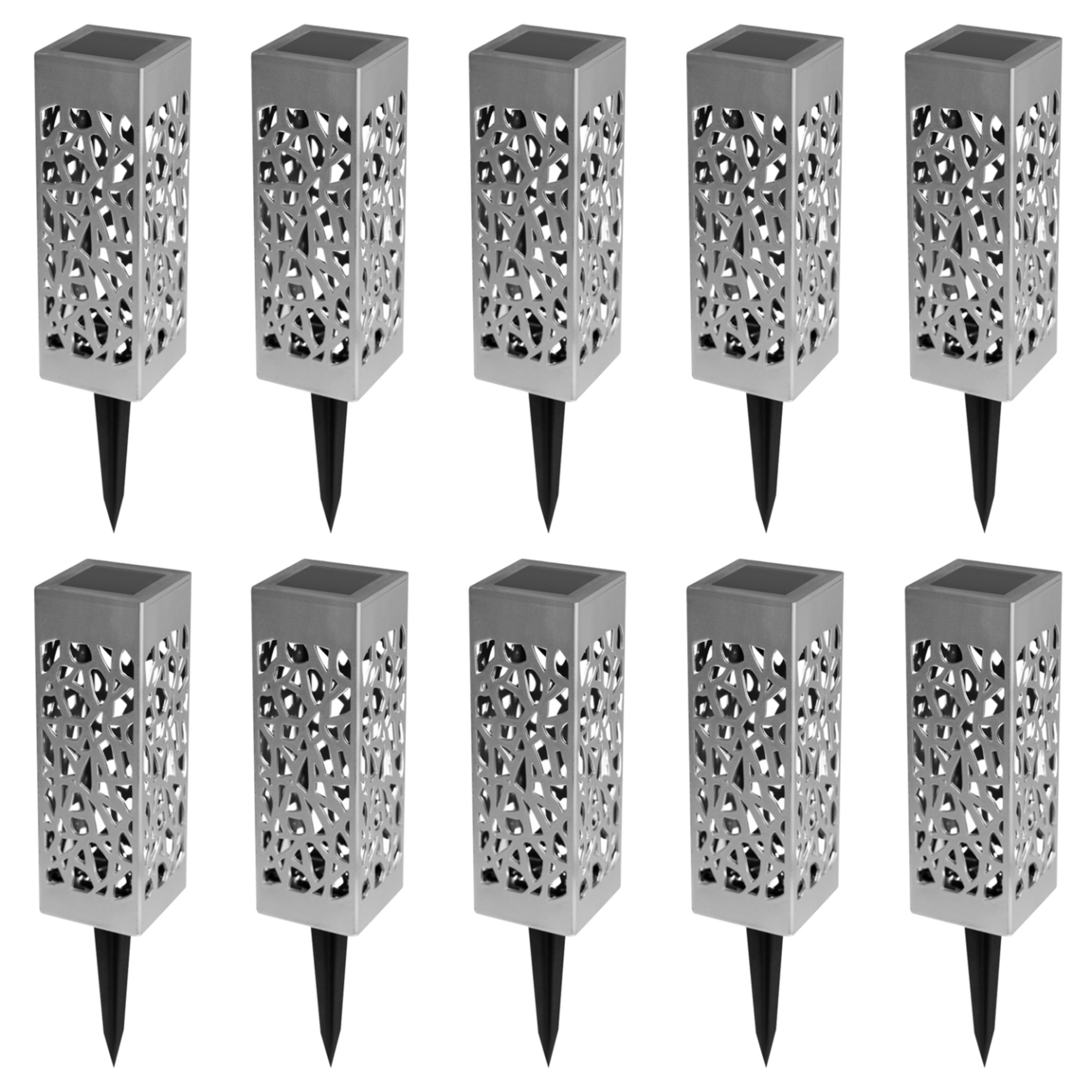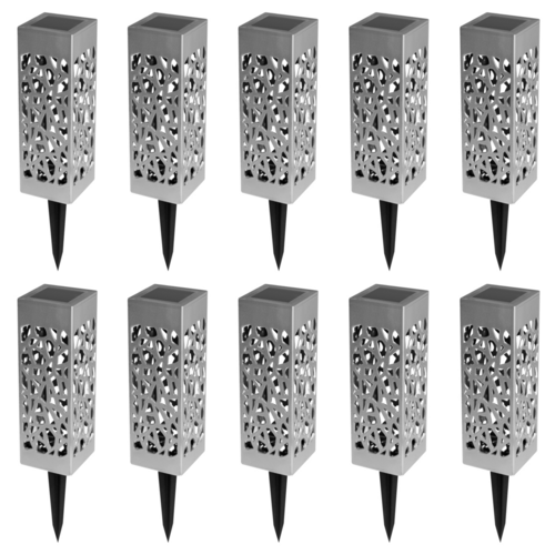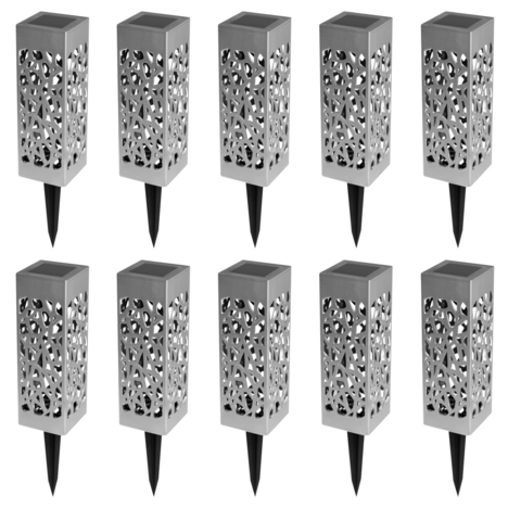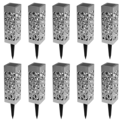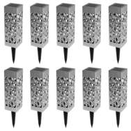Descriptif du lot de 10 lampes solaires MOLLYQu'elles soient plantées dans votre jardin ou simplement le long de votre terrasse, ces 10 bornes solaires seront du plus bel effet ! Avec leur design ajouré moderne, vous pourrez illuminer vos extérieurs en un rien de temps. Chaque face des lampes est aj