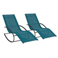 Offrez-vous un moment de détente et profitez des beaux jours sur ces 2 jolis bains de soleil à bascule bleu canard avec structure en acier et toile textilène MALAWI.Ces chaises longues sont les éléments indispensables d'un été réussi. Leur structure arrondie vous permettra de vous incliner agréablem