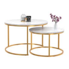 Que votre déco soit altique ou contemporaine, soyez certain que ce lot de 2 tables basses rondes effet marbre et doré s'y fondra parfaitement. Fonctionnelles et pratiques, ces petites tables basses peuvent s'imbriquer. Vous pouvez les moduler à votre guise, selon vos envies, ensemble ou séparément ! L'une à côté de l'autre pour un apéro convivial entre amis ou bien l'une sous l'autre pour un gain de place maximal !Ces tables de salon ALASKA au design moderne trouveront leur place dans votre intérieur grâce à cet effet marbre qui offre un aspect élégant à votre pièce de vie.Esthétiques mais pas que ! Que ce soit dans votre chambre, votre salon, ou même votre véranda, ces petites tables se glissent partout ! Vous pourrez les utiliser en tables basses de salon, en tables d'appoint ou bien en bouts de canapé !N'hésitez pas à vous servir des plateaux pour y disposer bougie, plante verte, lampe, objets de décoration... De plus, ces tables gigognes rondes ALASKA vous assurent robustesse et solidité grâce à leur structure en métal doré.Faites-vous plaisir grâce à ce lot de 2 tables basses gigognes rondes effet marbre et pied doré pas cher !Dimensions des 2 tables basses gigognes rondes effet marbre et pied doréDimensions de la grande table : Longueur 70 cm x largeur 70 cm x Hauteur 46 cmDimensions de la petite table : L. 54 x l. 54 x H. 35,5 cmMatériaux : MDF et métalÀ monter soi-mêmeDécouvrez l'ensemble de notre collection moderne ainsi que toutes nos tables basses gigognes sur notre boutique en ligne !
