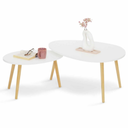 Apportez une vraie touche contemporaine à votre séjour grâce à ce lot de 2 tables basses gigognes aux finitions laquées blanches qui s'accorderont parfaitement à votre intérieur. Leur design, d'inspiration nordique, est à la fois ultra-tendance, simple et sophistiqué.À la fois pratiques et jolies, libre à vous d'agencer ces tables basses gigognes de la manière dont vous le souhaitez pour créer l'intérieur qui vous ressemble. Elément déco ou tables de rangement pour vos magazines, télécommandes ou petites plantes d'intérieur, chacune aura son utilité ! Idéales pour vos soirées télé ou apéritifs entre amis, vous pourrez également les placer facilement les unes sous les autres pour un rangement optimal permettant de gagner de l'espace !Véritables éléments de décoration, les tables basses gigognes apporteront un certain cachet à votre intérieur. Grâce à leur forme ovale et à leurs pieds en bois solides, ces tables de salon originales donneront un côté chaleureux à votre pièce de vie.La surface laquée brillante des tables offre quant à elle une touche contemporaine à votre intérieur et une finition raffinée. Enfin, le coloris blanc associé au bois clair des pieds créera à la fois de la luminosité et du contraste, pour un design épuré, chic et moderne.Que votre espace salon soit relativement petit ou très spacieux, ces deux tables basses GAIA y trouveront forcément leur place. À utiliser seules ou bien par 2, créez une atmosphère cocooning à petit prix grâce à ce lot au style scandinave !Dimensions des 2 tables basses gigognes GAIADimensions de la grande table basse : Longueur 80 cm x largeur 60 cm x Hauteur 40 cmDimensions de la petite table basse: L. 60 x l. 38 x H. 35 cmMatériaux : MDF et pieds en boisColoris : Blanc aux finitions laquéesÀ monter soi-mêmeModèle également disponible en gris et jaune ainsi qu'en gris et blanc.Retrouvez l'ensemble de notre collection scandinave sur notre boutique en ligne.