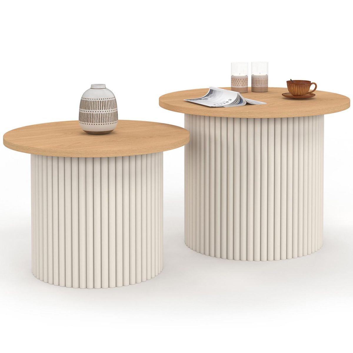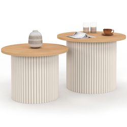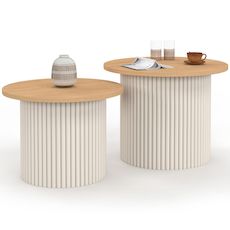 Lot de 2 tables basses gigognes KANEL rondes 40/45 effet cannelé beige et plateau bois