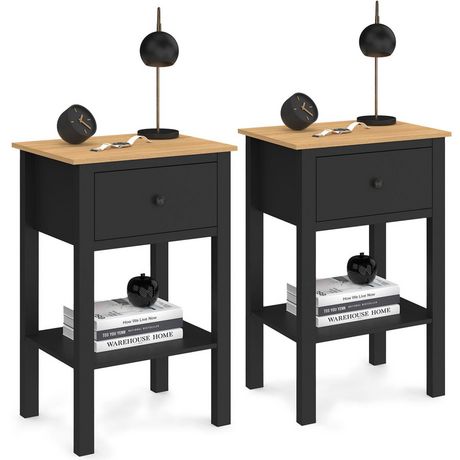 Offrez-vous ce lot de 2 tables de chevet noir et bois ACHILLE 1 tiroir avec étagère et apportez une touche tendance et élégante à votre intérieur.Ce meuble d'appoint est l'élément indispensable à intégrer dans votre chambre à coucher pour un rangement optimal. Son design chic aux lignes épurées apportera une véritable touche chaleureuse !Sa couleur noire altique et intemporelle associée à son plateau bois façon hêtre chaleureux permet à cette table de chevet de s'accorder à n'importe quelle décoration intérieure, pour un look sobre et élégant. Pratique et fonctionnelle grâce à son tiroir et sa tablette, vous pourrez y ranger toutes vos affaires personnelles tout en les ayant à portée de main. Cette table de chevet vous permet ainsi une meilleure organisation de vos affaires et vous offre une grande capacité de rangement ! Utilisez son plateau bois pour y déposer votre réveil, une jolie bougie ou tout autre élément de décoration. Les dimensions compactes du chevet, 40 x 30 x 60 cm, sont parfaites pour s'intégrer dans n'importe quelle pièce, mêmes les plus petits espaces.Alors n'attendez plus et craquez pour le chevet 1 tiroir avec tablette ACHILLE bois et noir, pour une touche moderne dans votre intérieur ! Dimensions des tables de chevet ACHILLE noir et boisDimensions totales : Longueur 40 cm x Largeur 30 cm x Hauteur 60 cmDimensions façade tiroir : L. 29 x H. 14 cmDimensions intérieures tiroir : L. 24,8 x l. 23,4 x H. 8 cmHauteur entre l'étagère et le sol : 16,5 cmHauteur entre l'étagère et le tiroir : 23,5 cmDimensions des pieds : 3,5 x 2,5 cmMatériaux : panneaux de particules de bois (PB)Coloris : noir et bois façon hêtreÀ monter soi-même Découvrez tous nos chevets modernes ainsi que nos meubles pour la chambre sur notre boutique en ligne.