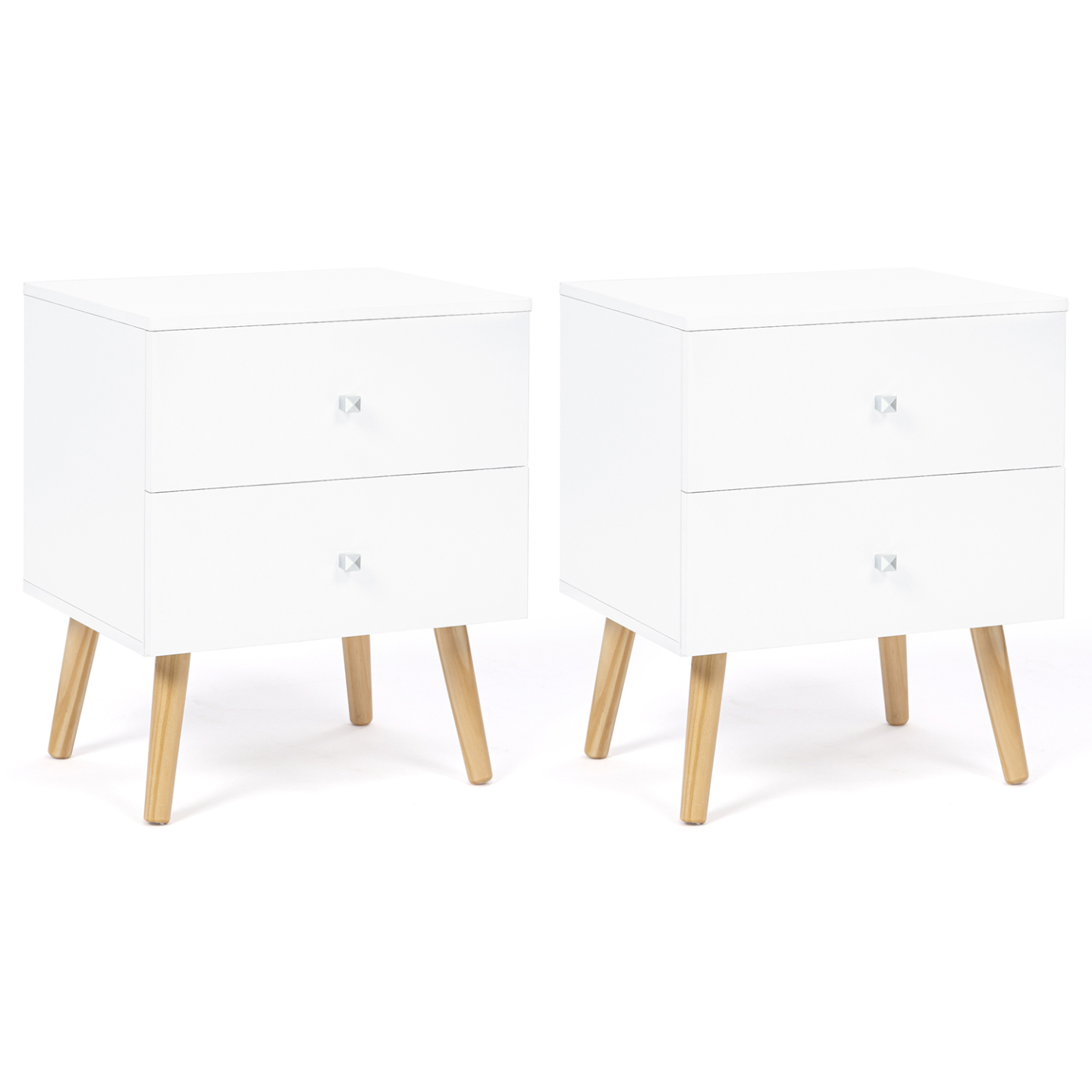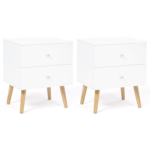 Pour une ambiance scandinave et chaleureuse dans votre chambre à coucher, optez pour ce lot de 2 tables de chevet EMMIE 2 tiroirs !Son coloris blanc et bois, son design sobre et ses lignes épurées apporteront l'esprit cocooning propre aux pays nordiques. Ultra fonctionnelles et élégantes, les tables de nuit s'accordent parfaitement avec n'importe quelle décoration intérieure ! Le chevet EMMIE est composé de 2 tiroirs de L.40 x l.34 x H.14 cm chacun, ce qui vous permet de ranger votre pilulier, télécommande, livre de chevet et tout votre nécessaire de nuit en toute discrétion. Classez et ordonnez vos affaires comme bon vous semble et conservez-les à portée de mains ! Utilisez le large plateau de vos chevets pour y poser une lampe ou votre tasse de thé lors de votre moment lecture du soir par exemple.Ingénieuses, nos tables de chevet ont été conçues pour vous offrir des solutions de rangement adaptées tout en réhaussant votre déco grâce à ses finitions soignées. Alors n'hésitez plus et laissez-vous tenter par ces 2 tables de chevet scandinaves blanches pour une chambre organisée en toute circonstance ! Dimensions du lot de 2 tables de chevet EMMIE 2 tiroirsDimensions hors tout : Longueur 40 cm x largeur 34 cm x Hauteur 50 cmDimensions d'un tiroir : L.40 x l.34 x H.15 cmMatériaux : PB 15 mmPieds en boisColoris : blancÀ monter soi-mêmeCe lot de 2 tables de chevet existe aussi en version 1 tiroir : - Lot de 2 tables de chevet EMMIE 1 tiroir scandinaves bois et blanc- Lot de 2 tables de chevet EMMIE 1 tiroir scandinaves bois et noirRetrouvez l'ensemble de notre collection EMMIE ainsi que nos tables de chevet sur notre boutique en ligne !