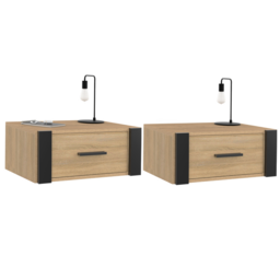 À la recherche d'un lot de 2 tables de chevet industrielles pour aménager votre chambre à coucher ? Optez pour ce lot de 2 tables de chevet murales ONYX coloris bois et noir.Dotées d'un grand tiroir fermé, vous pourrez y ranger toutes vos affaires personnelles, pour une chambre dégagée et zen en toutes circonstances. Pratiques et déco, rangez-y votre montre, livre de chevet, réveil, pilulier, produits de nuit, sans avoir à vous relever. La dimension du plateau bois est idéale pour recevoir une lampe de chevet ou d'appoint.Le contraste esthétique entre le coloris bois et noir habillera joliment votre intérieur avec alte et chic. Ces tables de chevet suspendues sont à la fois un élément design dans votre chambre à coucher, mais également un gain de place pour organiser au mieux votre espace, tout en facilitant le nettoyage et la mobilité autour. Idéales pour les petits espaces, les tables de chevet trouveront leur place dans votre chambre à coucher et apporteront chic et modernité. Stable et robuste, ce lot de tables de chevet pourra être installé facilement à la hauteur que vous souhaitez grâce au kit de fixations murales fourni.Craquez pour ces tables de chevet ONYX, aussi pratiques qu'esthétiques ! Dimensions du lot de 2 tables de chevet murales ONYXDimensions globales : Longueur 40 cm x largeur 30 cm x Hauteur 18 cmDimensions intérieures d'un tiroir : L. 26 x l.22 x H. 8 cmMatériaux : Panneaux de particulesColoris : Bois et noirÀ monter soi-mêmeRetrouvez l'ensemble de nos tables de chevet sur notre boutique en ligne !Retrouvez également toute la collection de meubles industriels sur notre boutique en ligne !