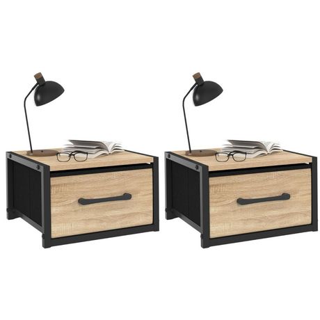 Ce lot de 2 tables de chevet murales UTAH, au style industriel, s'accordera parfaitement à la décoration de votre chambre à coucher grâce à son design élégant et moderne. Le mélange du bois et du métal noir habillera votre intérieur sans aucun doute et deviendra un élément de décoration à part entière.Ces tables de chevet suspendues sont à la fois un élément design dans votre chambre à coucher mais également un gain de place pour organiser au mieux votre espace, tout en facilitant le nettoyage et la mobilité autour. Le lot de 2 tables de chevet UTAH offre un espace de rangement suffisant grâce à son tiroir en tissu effet bois, dans lesquels vous pourrez ranger vos affaires personnelles, tout en les ayant à portée de main lorsque vous êtes dans votre lit. Grâce à leurs plateaux, vous pourrez installer votre lampe de chevet, réveil, ou tout autre objet de décoration.Idéal pour les petits espaces, les tables de chevet suspendues trouveront leur place dans votre chambre à coucher et apporteront chic et modernité. Stable et robuste, ce lot de tables de chevet industrielles pourra être installé facilement à la hauteur que vous souhaitez grâce au kit de fixations murales fourni.Dimensions du lot de 2 tables de chevet UTAH à suspendre Dimensions globales : Longueur 30 cm x largeur 30 cm x Hauteur 18 cmDimensions façade tiroir : L. 36,5 x H. 15,5 cm Dimensions intérieures tiroir : L. 26 x l. 28,5 x H. 13 cmMatériaux : panneaux de particules de bois (PB) et tubes métalColoris : bois et noirAttaches murales pour suspendre aux mursÀ monter soi-mêmeRetrouvez également toute la collection de meubles industriels sur notre boutique en ligne !