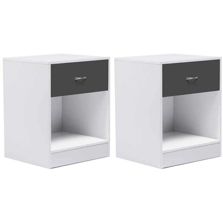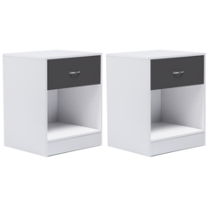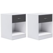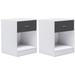 Jouez l'élégance et la modernité avec cet ensemble de 2 tables de chevet en bois aux finitions soignées.Leur design épuré tout en sobriété leur apporte une vraie touche contemporaine pour meubler avec goût votre chambre à coucher.Pratique avec leur tiroir grande contenance, elles vous permettent de ranger tous vos produits.Venez l'agrémenter d'une jolie lampe, elle mettra en valeur tous vos objets déco. Son compartiment vous permet de ranger tous vos livres du moment !Dimensions du lot de 2 tables de chevet OLGA bois blanc tiroir gris- Dimensions totales hors tout : Longueur 40 CM x largeur 34,5 CM x Hauteur 50 CM- Matériaux : Panneaux de particules de bois 12 MM + MDF 3 MM- Coloris : blanc et tiroir gris- Poignée façon chromé - finition mat - À monter soi-mêmeNos tables de chevet OLGA sont également disponibles dans d'autres coloris : - Lot de 2 tables de chevet OLGA bois blanc- Lot de 2 tables de chevet OLGA bois façon hêtre et tiroir blanc- Lot de 2 tables de chevet OLGA bois noir et tiroir façon hêtreDécouvrez tous nos modèles de tables de chevet ainsi que notre collection contemporaine.