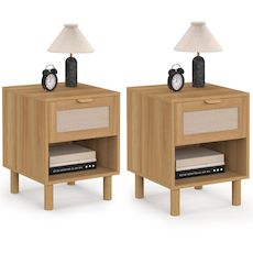 Leur style épuré et intemporel en fait un choix idéal pour créer une atmosphère apaisante. L'association du coloris bois et de la façade en tissu effet lin apporte une touche authentique et raffinée à votre décoration. Chaque chevet dispose d'un tiroir pratique qui permet de ranger vos objets personnels à l'abri des regards. Une niche ouverte complète le rangement et permet de garder vos essentiels à portée de main. Elle est idéale pour accueillir un livre, un réveil ou tout autre objet du quotidien que vous souhaitez garder accessible.Avec leurs dimensions compactes, ces chevets trouvent facilement leur place, même dans les espaces plus restreints. Leur hauteur est parfaitement adaptée pour une utilisation à côté d'un lit.Les pieds en bois de pin assurent une bonne stabilité tout en apportant une touche légère et moderne. Fabriqués à partir de panneaux de particules robustes, ces chevets offrent une bonne durabilité pour un usage quotidien. Ce lot de tables de nuit est idéal pour créer un ensemble harmonieux de chaque côté du lit. Pratiques et décoratifs, les chevets ROBIN sont la solution parfaite pour organiser votre espace nuit avec style et simplicité.Dimensions des chevets ROBIN 1 tiroirs avec niche bois et effet linDimensions globales : Longueur 40 cm x largeur 40 cm x Hauteur 50 cmHauteur des pieds : 12 cmDimensions façade du tiroir : L. 36 x H. 17,5 cm Dimensions intérieures du tiroir : L. 32,5 x l. 28,5 x H. 12 cmDimensions niche : L. 37,5 x l. 38 x H. 18 cmMatériaux : Panneaux de particules (PB), tissu et bois de pinColoris : Bois et beigeÀ monter soi-même