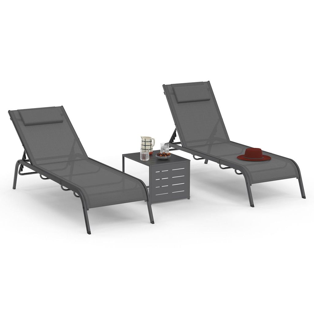 Lot de 2 transats de jardin inclinables BORA avec table d'appoint modulable en acier gris anthracite et toile grise