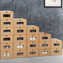 N'attendez plus pour organiser de façon astucieuse vos chaussures et accessoires. Ce lot de 20 cartons de rangement à chaussures est indispensable pour optimiser l'espace d'un placard ou d'une armoire.Ces boites multi-usages tiroir intégré peuvent être utilisées pour des chaussures style baskets, talons, bottines, etc. Ces boites de rangement à chaussures sont faites en papier craft avec une fenêtre en plastique transparente pour apporter de la visibilité.Les boites ont une ouverture coulissante pour un usage quotidien. Vous pouvez aussi les utiliser pour y ranger vos accessoires ou des jouets, elles ont une grande capacité. Le lot de 20 boites de rangement est facile et rapide à assembler.Le carton ondulé utilisé est de haute qualité pour une maxi résistance. Vous avez la possibilité de créer des modules pour gagner de l'espace. Facile à empiler dans votre dressing, elles se modulent selon votre besoin pour un gain de place assuré. Organisez vos placards ou votre entrée.Dimensions des boîtes à chaussures en carton- Dimensions : L.35 x l.23,5 x H.13,5 cm- Matériaux : carton + PVC (carte transparente)- Couleur : brun- Poids : 0,35 kg- Quantité : 1 lot de 20 pcs