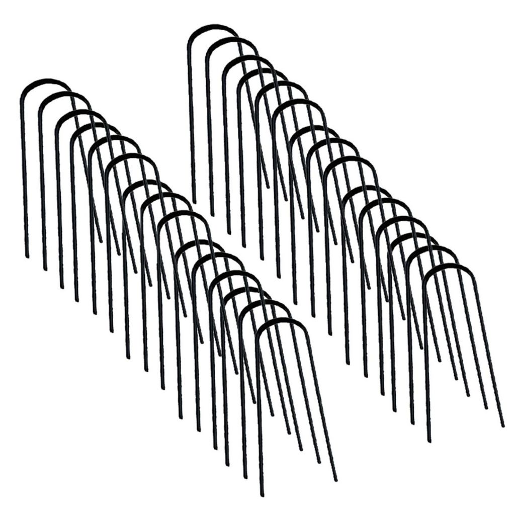 Ce lot de 30 agrafes au format arrondi facilitera la fixation de vos toiles et bâches de paillage ! Équipez-vous de cet accessoire indispensable pour maintenir comme il se doit vos bâches sur votre sol. Vos par-terres de fleurs, votre potager et vos espaces verts seront protégés des éventuelles pousses de mauvaises herbes ou encore des intempéries grâce à une bâche/toile bien maintenue au sol. En cas de vent, ces 30 piquets en forme de U se montrent robustes et ne craignent pas les intempéries ! Quelles que soient les conditions météorologiques, ces accessoires assureront un maintien optimum de vos bâches. Grâce aux 2 tiges de 10 cm de haut chacune, les piquets se plantent directement dans le sol et peuvent être déplacés à plusieurs reprises. Veillez tout de même, lors de la pose, à la présence d'obstacles dans le sol qui pourraient endommager les tiges. Ce lot de 30 agrafes convient aux bâches de paillage, aux feutres de paillage, aux voiles, aux tunnels de forçage, etc. même en cas de vent. Il est recommandé, sur un terrain plat, de poser 1 agrafe par mètre.