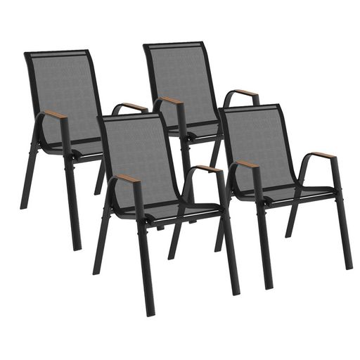 En savoir +Avec ce lot de 4 chaises de jardin NOUMEA noir et bois, installez-vous dans votre jardin ou sur votre terrasse pour profiter du soleil et faire le plein de vitamine D ! Vous pourrez meubler votre jardin facilement et passer du temps à lire un livre, manger un bon repas ou tout simplement prendre un apéritif entre amis. Très confortable, ce lot de 4 chaises est doté d'une assise en textilène souple et agréable et d'une structure en acier qui lui confère une grande stabilité et robustesse. De plus, les chaises NOUMEA disposent d'accoudoirs qui vous permettront de passer un agréable moment en extérieur, comme si vous étiez dans un fauteuil ! Avec son style élégant et moderne, le coloris noir associé au bois des accoudoirs s'accordera parfaitement avec la plupart de vos meubles de jardin. Idéalement pensées pour s'installer autour d'une table, ces chaises peuvent également se coupler avec tout autre modèle de salon de jardin. Multifonctions, vous pourrez utiliser les chaises de jardin aussi bien en intérieur qu'en extérieur, lorsque vous avez besoin d'assises supplémentaires pendant de grandes réceptions à domicile. De plus, les matériaux utilisés sont la grande force de ce lot de chaises car ils ne nécessitent presque aucun entretien !Pratiques, ces 4 chaises s'empilent parfaitement pour vous permettre de les ranger facilement pour la saison hivernale ou lorsque vous ne les utilisez pas. Et si vous souhaitez les protéger, optez pour une housse pour chaises de jardin.Dimensions du lot de 4 chaises de jardin empilables Dimensions globales : Longueur 52 cm x longueur 65 cm x Hauteur 84 cmMatériaux : Métal et textileneColoris : Noir et boisÀ monter soi-même Découvrez aussi nos autres références de salon de jardin sur notre boutique en ligne !
