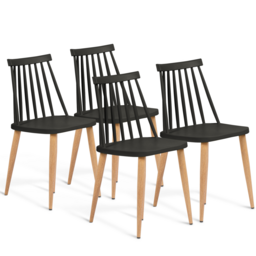 Avec leur look vintage les chaises LILY noires apporteront une touche rétro à votre décoration intérieure. Elles s'adapteront aussi bien à votre cuisine qu'à votre salle à manger grâce à leur ligne épurée digne des pays nordiques. Peu encombrantes vous pourrez aussi les utiliser en chaise de bureau. Avec leurs pieds inclinés, profitez d'une note scandinave dans votre intérieur. Cet ensemble de chaises est composé de sièges en polypropylène et de pieds en métal imitation bois. Avec un tel revêtement vos chaises seront faciles à nettoyer au quotidien. Profitez également d'une excellente stabilité grâce aux 4 pieds de 4 cm de diamètre. Les 8 barreaux qui forment le dossier apportent maintien et confort pour votre dos tout en proposant un design rétro. Ce lot de 4 chaises vendu à prix canon est idéal pour renouveler votre déco ! Dimensions des 4 chaises LILY noiresDimensions globales : Longueur 42 cm x largeur 39 cm x Hauteur 79 cmDimensions de l'assise : L. 42 x l.39 x H. dossier 36,5 cmÉpaisseur de l'assise : 3 cmDiamètre des pieds : 4 cmHauteur entre le sol et l'assise : 42,5 cmLargeur de la barre horizontale du dossier : 5 cmNombre de barreaux : 8Dimensions d'un barreau : l. 2 x H. 32 cmMatériaux : assise en polypropylène et pieds en métalÀ monter soi-mêmeDécouvrez également ce modèle dans un autre coloris sur notre boutique en ligne :– Lot de 4 chaises LILY blanches pour salle à manger