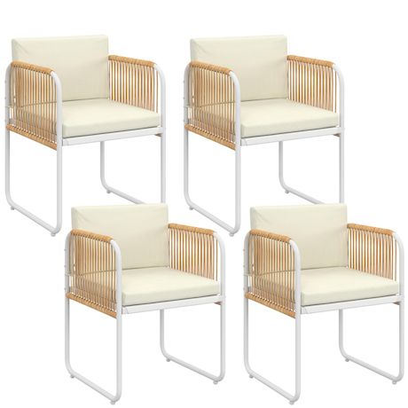 Ce lot de 4 chaises d'extérieur RIO apportent design et esthétisme à votre jardin grâce à leur look bi-matière en métal blanc et au cordage effet rotin avec coussins beiges. Pensées pour s'installer autour d'une table, ces chaises de jardin en textilène peuvent également venir compléter un autre ens