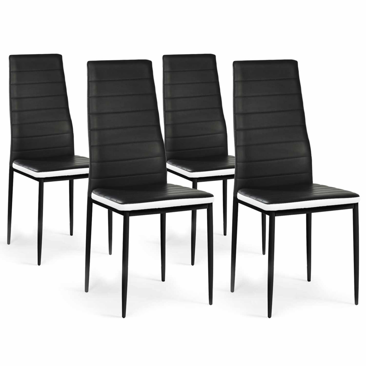 Elégantes et épurées, ces 4 chaises ROMANE confortables apporteront une touche de modernité dans votre salle à manger.Idéal pour votre salon ou votre cuisine, ce lot de 4 chaises noires avec leur assise matelassée entourée d'un bandeau blanc au design contemporain se mariera parfaitement dans votre intérieur.Elles garantissent une assise confortable grâce à leur rembourrage et leur haut dossier. Passez d'agréables moments à table avec votre famille et vos amis.Si vous êtes à la recherche de chaises design pas chères noires bandeau blanc, nous vous proposons un lot à un prix imbattable. Aménagez votre séjour avec ces chaises tendance et design.Vous pouvez également découvrir les chaises ROMANE entièrement noires X6 si vous êtes un amateur de cette couleur.Revêtement en PVC pour un nettoyage facile et pieds étal peint noir.Dimensions des chaises ROMANE noiresDimensions globales : Longueur 42 cm x largeur 48 cm x Hauteur 97 cmRevêtement assise PVCPieds métal peints en noirVendues en lot de 4 chaises À monter soi-mêmeRetrouvez tous nos coloris disponibles sur notre boutique en ligne :- Lot de 6 chaises ROMANE noires bandeau blanc pour salle à manger- Lot de 6 chaises ROMANE noires pour salle à manger- Lot de 6 chaises ROMANE grises pour salle à manger- Lot de 6 chaises ROMANE grises bandeau blanc pour salle à manger