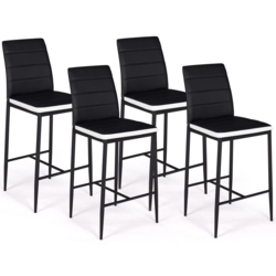 Vous souhaitez apporter une touche de design à votre cuisine ou à votre salle à manger ? Offrez-vous ce lot de 4 tabourets ROMANE noirs avec un bandeau blanc. Moderne et épuré, ce lot de 4 tabourets de bar trouvera facilement sa place dans votre intérieur et s'accordera parfaitement avec votre décoration. Grâce à leur revêtement en PVC noir très simple à nettoyer, fini les salissures sur votre assise ou vos pieds de tabouret ! La hauteur d'assise de 65 cm et le haut dossier de 35 cm vous assurent un bon maintien une fois assis. De plus le tabouret ROMANE est muni d'un discret repose-pied. Passez vos repas confortablement installé sur une assise et un dossier ergonomiques en PU rembourrés. La conception des pieds du tabouret en métal droit avec repose-pieds assure une bonne stabilité à la chaise de bar. Son design contemporain aux couleurs sobres vous offre tous les bénéfices d'une chaise à hauteur de vos îlots et tables hautes.Alors n'hésitez-plus et optez pour le lot de 4 tabourets ROMANE alliant confort et design !Dimensions des tabourets ROMANE noir et bandeau blancDimensions totales : Longueur 43 cm x largeur 52 cm x Hauteur 100 cmHauteur d'assise : 65 cmDimensions assise : L.43 x l. 39 cmHauteur du dossier : 35 cmPieds métalAssise : revêtement PVC rembourré noir avec un bandeau blancÀ monter soi-même Ce modèle de tabourets de bar ROMANE existe en différents coloris : - Lot de 4 tabourets ROMANE en PVC gris bandeau blanc- Lot de 4 tabourets ROMANE en PVC noir- Lot de 4 tabourets ROMANE en PVC grisRetrouvez également l'ensemble de nos tabourets sur notre boutique en ligne.
