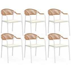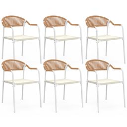 Vous allez passer un été confortable et ensoleillé sur votre terrasse grâce à ce lot de 6 chaises de jardin MADEIRA en métal blanc et imitation rotin ! Profitez du confort de l'assise en textilène beige pour apprécier de bons repas autour de votre table de jardin, lire un livre ou tout simplement prendre un apéritif entre amis. Avec son look bicolore et bi-matière en métal blanc et cordage rotin, ce lot de 6 chaises de jardin apportera design et esthétisme à votre extérieur ! Idéalement pensées pour s'installer autour d'une table, elles peuvent également se coupler avec tout autre modèle de salon de jardin.Le mélange des couleurs blanc, beige et imitation rotin s'harmoniseront parfaitement à votre table de jardin, elles apportent un look tendance, lumineux et chaleureux à votre espace extérieur. Fabriquées avec des matériaux de qualité, les chaises avec accoudoirs MADEIRA vous garantissent stabilité, robustesse et résistance au soleil ainsi qu'aux intempéries ! Vous pourrez utiliser les chaises de jardin aussi bien en intérieur qu'en extérieur, lorsque vous avez besoin d'assises supplémentaires lors de grands événements. Les matériaux utilisés sont idéals pour un usage en extérieur et ne nécessitent presque aucun entretien !Grâce à leur assise large et à leur dossier incurvé, vous serez confortablement installé pour profiter de moments ensoleillés avec vos amis ou votre famille. Dimensions des chaises de jardin MADEIRADimensions globales : Longueur 57 cm x largeur 51 cm x Hauteur 77 cmDimensions de l'assise : L. 47 x l. 51 x H. 37 cmMatériaux : structure en acier, dossier et accoudoirs en polyrotin et assise en textilèneColoris : blanc, beige et osierÀ monter soi-mêmeDécouvrez également tous nos salons de jardin sur notre boutique en ligne !
