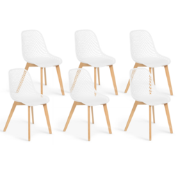 Vous êtes à la recherche de chaises design avec une assise qui soit aussi belle que confortable ? Choisissez notre lot de 6 chaises MANDY ! Le dossier ajouré des chaises apporte au modèle un style graphique très en vogue en ce moment.Que vous choisissiez de les installer dans votre salle à manger, votre cuisine ou encore votre bureau, ces chaises scandinaves blanches trouveront leur place à coup sûr dans n'importe quelle pièce de votre maison.En plus d'apporter une touche de modernité à votre pièce, elles offrent un confort des plus agréables. Le dossier de ces chaises en polypropylène assure flexibilité et solidité au modèle. Très stables, elles disposent de 4 pieds en bois aux finitions travaillées.De couleur blanche, elles s'accorderont à tous les styles d'intérieur, et s'adapteront à votre mobilier. De plus, leur pieds en bois apporteront du cachet à l'ensemble de la chaise.Profitez d'un design tendance et d'un petit prix avec ce joli lot de 6 chaises !Dimensions des 6 chaises scandinaves MANDY blanchesDimensions totales : Longueur 46 cm x largeur 56 cm x Hauteur 86 cmDimensions de l'assise : L. 46 x l. 46 x H. 46 cmDossier en polypropylènePieds en boisVendues en lot de 6 chaises coloris blancÀ monter soi-mêmeModèle également disponible par exemple en lot de 4 chaises blanches ou en lot de 6 chaises noires.Retrouvez l'ensemble de nos chaises scandinaves sur notre boutique en ligne !