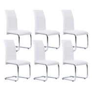 Invitez le design contemporain dans votre salle à manger avec ce lot de 6 chaises MIA blanches. Ces 6 chaises aux lignes épurées s'adapteront parfaitement à votre séjour et lui apporteront une touche moderne et élégante !La structure de cette chaise et ses pieds en métal chromé vous offrent une vraie stabilité et une véritable solidité. Son assise et son dossier, moelleux et rembourrés, en mousse recyclée, vous garantissent un confort optimal, idéal pour des repas conviviaux entre amis ou en famille.Le revêtement de cette chaise est en polyuréthane et les pieds en métal chromé. Profitez de son coloris blanc pour apporter de la luminosité à votre pièce de vie !Très design et tendance, ce lot de 6 chaises MIA blanches offrira une touche de modernité à votre décoration, le tout à petit prix !Dimensions des chaises MIA blanchesDimensions globales : Longueur 43,5 cm x largueur 54 cm x Hauteur 98 cmDimensions de l'assise : L. 43 x l. 43,5 x H. 46 cmHauteur des pieds : 41 cmRevêtement en polyuréthane et pieds en métal chroméColoris : blancÀ monter soi-mêmeLe lot de 6 chaises est aussi disponible en coloris noir liseré blanc.
