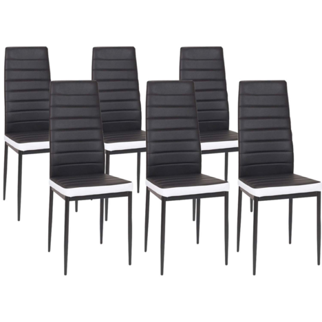 Elégantes et épurées, ces 6 chaises ROMANE confortables apporteront une touche de modernité dans votre salle à manger.Idéal pour votre salon ou votre cuisine, ce lot de 6 chaises noires avec leur assise matelassée entourée d'un bandeau blanc au design contemporain se mariera parfaitement dans votre intérieur.Elles garantissent une assise confortable grâce à leur rembourrage et leur haut dossier.Revêtement en PVC pour un nettoyage facile et pieds en métal peint noirDimensions des chaises ROMANE noires et blanchesDimensions: Longueur 42 cm x largeur 48 cm x Hauteur 97 cmRevêtement assise PVCPieds métal peints en noirVendues en lot de 6 chaisesÀ monter soi-mêmeRetrouvez tous nos coloris disponibles sur notre boutique en ligne :- Lot de 6 chaises NOIRES pour salle à manger- Lot de 6 chaises GRISES pour salle à manger- Lot de 6 chaises GRISES BANDEAU BLANC pour salle à manger- Lot de 4 chaises NOIRES BANDEAU BLANC pour salle à manger