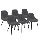 À la recherche de nouvelles chaises pour moderniser votre pièce de vie ? Craquez pour ce lot de 6 chaises en velours gris THALYA avec demi-accoudoirs ! Leur design vintage et élégant s'adaptera à tous les styles de décoration. Idéales pour apporter une touche sophistiquée à votre intérieur, les chaises THALYA sont dotées d'un design original et tendance qui s'associe à merveille avec leur coloris gris foncé intemporel et chaleureux.Partagez de bons repas en famille ou entre amis confortablement installés grâce à leur coussin en velours qui leur offre un aspect cossu et moelleux. Les demi-accoudoirs de la chaise apportent un look contemporain raffiné à votre salle à manger et proposent une assise enveloppante très agréable. Pratiques et fonctionnelles, les chaises peuvent aussi être dissociées dans d'autres pièces de la maison : donnez du style à votre chambre en disposant une chaise devant votre coiffeuse ou utilisez-la en tant que chaise de bureau pour un coin travail chic et cocooning !Leurs pieds fins en métal noir mettent en valeur les lignes épurées de ces chaises et leur assurent stabilité et robustesse.Sublimez votre coin repas en un tour de main grâce à ce lot de 6 chaises avec accoudoirs THALYA en velours gris foncé !Dimensions des chaises THALYA en velours grisDimensions globales : Longueur 47,5 cm x largeur 54 cm x Hauteur 79 cmDimensions de l'assise : L. 47,5 x l. 39 x H. 49 cmHauteur du dossier : 35,5 cmÉpaisseur du coussin : 5 cmMatériaux : assise en velours et pieds en métalColoris : gris foncéVendues en lot de 6 chaisesÀ monter soi-mêmeCe modèle est également disponible en lot de 4 et dans d'autres coloris :- Lot de 4 chaises THALYA en velours gris foncé- Lot de 4 chaises THALYA en velours gris clair- Lot de 4 chaises THALYA en velours bleu- Lot de 4 chaises THALYA en velours beige- Lot de 4 chaises THALYA en velours gris et bleu- Lot de 4 chaises THALYA en velours gris, bleu et jauneRetrouvez l'ensemble de nos chaises en velours et de notre collection de meubles vintage sur notre boutique en ligne !