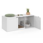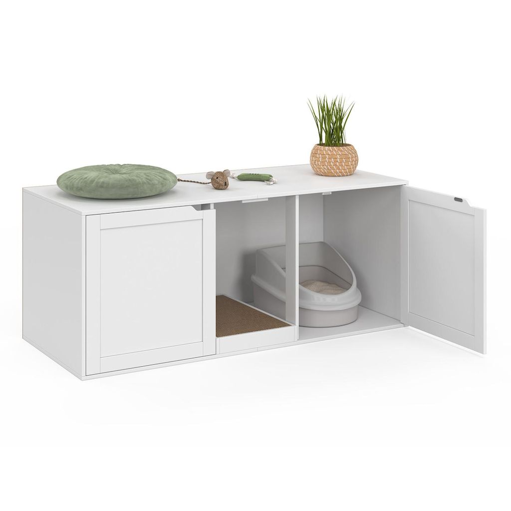Avec ses dimensions généreuses, ce meuble offre un espace confortable pour votre animal tout en restant compact et fonctionnel. Les deux portes de 43,5 cm facilitent l'accès et l'entretien, tout en maintenant la litière à l'abri des regards.Fabriqué en MDF et panneaux de particules, il assure une bonne robustesse et une stabilité optimale.Ce meuble multifonction intègre également un griffoir en carton ondulé, idéal pour permettre à votre chat de faire ses griffes et préserver ainsi vos meubles. Un véritable atout pour le confort et l'équilibre de votre compagnon.Pratique et bien pensé, il propose un rangement utile tout en dissimulant efficacement la litière, contribuant à un intérieur plus propre et organisé.Facile à intégrer dans un salon, une salle de bain ou une buanderie, cette maison pour chat combine fonctionnalité, esthétique et bien-être animal.Dimensions de la maison de toilettes pour chat XL Dimensions globales : Longueur 120 cm x largeur 52 cm x Hauteur 50 cmMatériaux : MDF, panneaux en particules de bois et carton ondulé (griffoir)Dimensions griffoir : L. 30 x l. 50 x H. 5 cm 2 portes, longueur 43,5 cmColoris : BlancÀ monter soi-mêmeRetrouvez l'ensemble des accessoires pour animaux sur notre site !