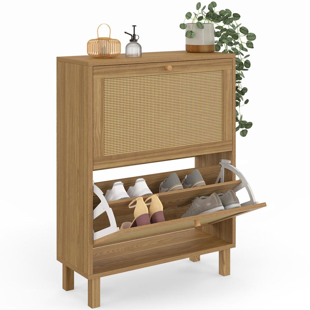 Apportez un esprit naturel et élégant à votre entrée avec ce joli meuble à chaussures HANAE 2 portes effet cannage. Les façades en cannage plastique apporteront une touche chaleureuse et lumineuse dans votre entrée et s'intégreront parfaitement dans tous les types d'intérieurs ! Pratiques et fonctionnels, ses 2 compartiments dotés chacun d'une cloison intermédiaire offrent une grande capacité de rangement et peuvent accueillir jusqu'à 12 paires de chaussures, soit 6 paires par compartiment.De plus, les dimensions compactes de ce meuble seront parfaites pour optimiser votre entrée ou même votre dressing laissant vos chaussures à l'abri des regards et de la poussière pour un espace toujours ordonné !Ses 4 pieds en bois et sa structure en panneaux de particules vous garantissent stabilité et robustesse.Vous n'aurez plus qu'à poser de jolis objets décoratifs ou de petites plantes vertes sur le dessus du meuble et le tour et joué !Dimensions du meuble à chaussures vintage HANAE 2 portes effet cannageDimensions globales : Longueur 60 cm x largeur 23,5 cm x Hauteur 83,5 cmDimensions des pieds : L. 3,1 x l. 3,1 x H. 10cmDimensions façade portes : L. 34 x H. 56 cmEncadrement porte : 4 cmPoignées : 2,5 x 1,7 x 1,7 cm 2 portes battantesMatériaux : panneaux de particules de bois (PB)+ cannage PVC + pieds en bois de pin Coloris : boisÀ monter soi-mêmeRetrouvez l'ensemble de notre collection cannage ainsi que l'ensemble de nos meubles d'entrée sur notre boutique en ligne !