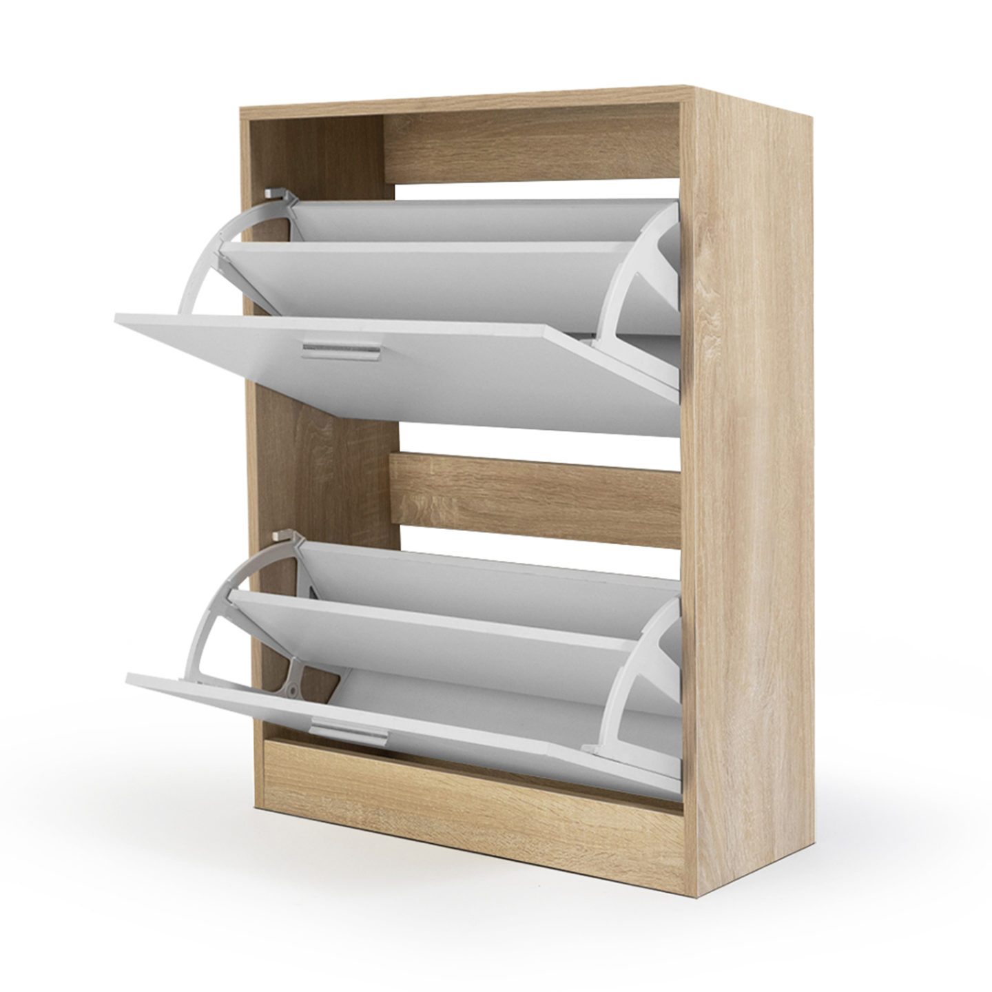 Optimisez l'espace dans votre maison, gagnez du temps grâce à notre meuble à chaussures imitation hêtre et ses 2 portes blanches.Son design fonctionnel, chic et moderne lui permettra de s'adapter idéalement chez vous !Stable et robuste, sa structure est en panneaux de particules de bois (PB épaisseur 1,5 cm).Composé de 2 portes, 2 espaces de rangement, ce meuble d'appoint optimise et habille tout type de couloir, d'entrée de façon moderne et fonctionnelle ! Chaque espace de rangement s'ouvre à l'aide de la poignée.Grâce à sa grande capacité de rangement, ce meuble à chaussures peut contenir jusqu'à 12 paires de chaussures (6 paires par espace de rangement).Chaque espace de rangement est séparé par une planche.4 patins sont fournis.Montage facile.Pour éviter tout risque de basculement, il est recommandé de le fixer au mur.Dimensions du meuble à chaussures imitation hêtre 2 portes blanchesDimensions globales : Longueur 63,5 cm x largeur 24 cm x Hauteur 80,5 cmDimensions de la porte : Longueur 59,5 cm x Hauteur 34,5 cmDimensions de l'espace de rangement : Longueur 59,5 cm x Profondeur 24 cm x Hauteur 34,5 cmDimensions de la poignée de la porte : Longueur 10,5 cm x largeur 2 cmÉpaisseur de la poignée de la porte : 1 cmHauteur du sol à la première poignée : 38,5 cmHauteur du sol à la seconde poignée : 73,5 cmHauteur des portes basculantes : 37 cmMeuble à chaussures prévu pour des pointures allant jusqu'au 41À monter soi-mêmePour éviter tout risque de basculement, il est recommandé de le fixer au mur.Modèle disponible en différents coloris sur notre boutique en ligne :- Meuble à chaussures 2 portes blanc- Meuble à chaussures blanc 2 portes grises- Meuble à chaussures imitation hêtre 2 portes blanchesRetrouvez toute notre gamme de meuble à chaussures sur notre boutique en ligne !