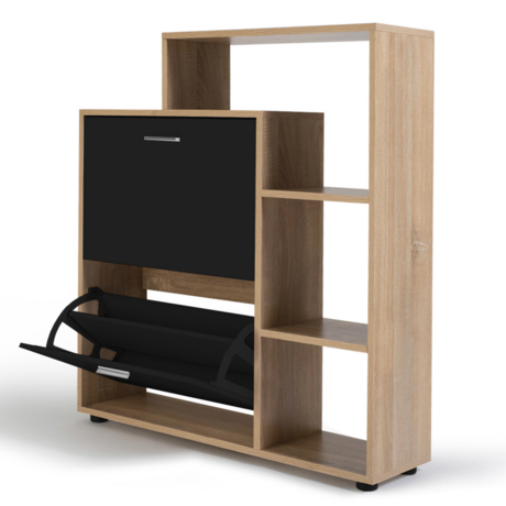 Descriptif du meuble à chaussures imitation hêtre 2 portes noires avec étagère Gagnez de l'espace et du temps dans votre maison, dans votre entrée, dressing ou buanderie, avec notre meuble à chaussures 2 portes avec étagères !Ce range-chaussures, maxi capacité, aux couleurs naturelles, chic et tendance, s'intègre parfaitement dans n'importe quel type d'intérieur grâce à son design épuré. Peu profond, il laissera le passage dégagé !Il habille tout type de couloir, d'entrée, de pièce, de façon moderne !Ouvrez chaque casier à l'aide de la poignée finition argentée. Le mécanisme type menu déroulant vous permet de choisir rapidement la paire qu'il vous faut. Chaque espace de rangement possède une planche modulable séparant les deux rangées de paires de chaussures.Ce meuble vous offre une grande capacité de rangement, il peut contenir jusqu'à 6 paires de chaussures par espace de rangement, soit 12 paires au total = 24 chaussures, que vous pouvez organiser par rangée et trier par saison !Gain de place au sol assuré avec ce meuble conçu en hauteur ! Fini les chaussures qui traînent dans l'entrée ou qui prennent la poussière !L'étagère 4 niveaux, 3 niches et 1 plateau, double la capacité de rangement. Plus besoin de chercher vos clés ou votre courrier ! Vous n'avez plus qu'à y disposer une petite plante verte et des paniers de rangement pour apporter votre petite touche de décoration pour un intérieur chaleureux et personnalisé.La structure de ce meuble en panneaux de particules de bois (PB épaisseur 1,5 cm) vous garantit solidité et robustesse.4 patins sont offerts pour ce meuble.Facile à monter.Pour éviter tout risque de basculement, il est recommandé de le fixer au mur.Meuble à chaussures prévu pour des pointures allant jusqu'au 41.Dimensions du meuble à chaussures façon bois 2 portes noires avec étagèresDimensions globales : Longueur 86,5 cm x largeur 24 cm x Hauteur 90 cmDimensions de la partie meuble à chaussures : L. 60,5 x l.24 x H. 77,5 cmDimensions des tiroirs : L. 56 x l. 24 x H. 35 cmDimensions étagère : L. 60 x l. 24 x H. 90 cmMatériaux : Panneaux de particules (PB)Coloris : Bois et noirCapacité : 12 paires de chaussures