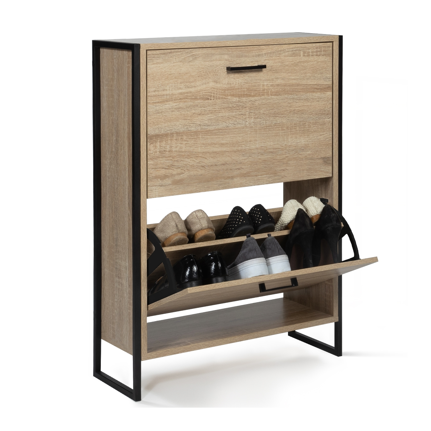 Avec sa capacité de 12 paires de chaussures, 6 paires par compartiment, toute la famille trouvera une place de rangement pour garder ses chaussures à l'abri de la poussière ! Les 2 espaces de rangement sont séparés intérieurement par une cloison intermédiaire pour organiser votre dressing à chaussures.Le format abattant des portes, gain de place et astucieux, permet une ouverture facilitée.Les jolies poignées intégrées ainsi que la structure en métal noir apportent design, robustesse et stabilité au meuble.Bi matière bois imitation hêtre/métal, ses coloris naturels chaleureux feront de votre vestibule un espace accueillant et bien rangé ! Un look industriel sobre pour une entrée ultra nette !Ses finitions soignées vous donnent la possibilité de le ranger dans une buanderie, un dressing, ou même une entrée !Vous n'avez plus qu'a poser de jolis objets décoratifs ou de petites plantes vertes sur le dessus du meuble.Combinez les par 1, par 2 ou par 3 selon vos besoins !Ultra plat, avec sa profondeur de 23,5 cm et son design tout en hauteur, il vous fera gagner de la place et n'encombrera pas votre pièce !Son format légèrement surélevé est idéal pour nettoyer sous le dessous du meuble.Ne laissez plus traîner vos paires de chaussures et gardez-les à l'abri des regards derrière ce meuble de rangement moderne et discret !Pratique et en plein dans la tendance du moment !A fixer au mur pour éviter tout risque de basculement.Dimensions du meuble chaussures LUIS design industrielDimensions globales : L.63.2 x l.23.5 x H.85 cmHauteur des portes basculantes : 35 cmHauteur des pieds : 10 cmMeuble à chaussures prévu pour des pointures allant jusqu'au 41À monter soi-même
