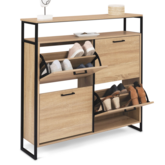 Avec sa capacité de 16 paires de chaussures, 5 par compartiment, toute la famille trouvera une place de rangement pour garder ses chaussures ordonnées et à l'abri des regards ! Les 4 espaces de rangement sont compartimentés à l'aide d'une cloison intermédiaire, pour organiser votre dressing à chaussures selon vos envies et vos besoins.Le format abattant astucieux des portes garantit quant à lui non seulement un gain de place, mais aussi une ouverture facilitée !Son étagère supérieure d'une hauteur de 13 cm est idéale pour exposer bibelots, bougies, ou encore vide-poche. Vous n'avez plus qu'à poser de jolis objets décoratifs ou de petites plantes vertes sur le dessus du meuble.Pratique, mais pas que ! Les jolies poignées, la structure design en métal noir et les coloris naturels et chaleureux de cette armoire chaussures bi-matière feront de votre vestibule un espace accueillant et bien rangé ! Un look industriel sobre pour une entrée rangée !Ultra compact, avec sa profondeur de 23,5 cm et son design tout en hauteur, il optimisera l'espace et n'encombrera pas votre pièce, tout en restant stable et robuste. Son format légèrement surélevé est idéal pour nettoyer sous le dessous du meuble.Ses finitions soignées vous donnent la possibilité de le placer dans une buanderie, un dressing, ou même une entrée ! Utilisez-le seul ou combinez-les par 2 ou par 3 selon vos besoins !Ne laissez plus traîner vos paires de chaussures et gardez-les organisées avec ce meuble de rangement LUIS moderne et discret !Dimensions du meuble à chaussures LUIS avec étagèreDimensions globales : Longueur 100 cm x largeur 23,5 cm x Hauteur 97 cmDimensions des portes : L. 45,5 x H. 35 cmHauteur entre les 2 étagères : 13,5 cmHauteur des pieds : 8 cmPanneaux de particules de bois (PB) - épaisseur 1,2 cm et 1,5 cmMétal noir 1,6 x 1,6 cmCapacité : 16 paires de chaussuresMeuble à chaussures prévu pour des pointures allant jusqu'au 41À fixer au mur pour éviter tout risque de basculementÀ monter soi-mêmeModèle également disponible en version 2 portes avec étagère.Retrouvez l'ensemble de nos meubles chaussures ainsi que notre collection industrielle sur notre boutique en ligne !