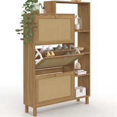 Apportez un esprit naturel et élégant à votre entrée avec ce joli meuble à chaussures cannage HANAE 3 portes et étagères. Les façades en cannage plastique apporteront une touche chaleureuse et lumineuse dans votre entrée et s'intégreront parfaitement dans tous les types d'intérieurs ! Pratiques et fonctionnels, ses 3 compartiments dotés chacun d'une cloison intermédiaire offrent une grande capacité de rangement et peuvent accueillir jusqu'à 18 paires de chaussures, soit 6 paires par compartiment.Ses étagères apporteront des espaces supplémentaires de rangement ou vous permettront d'apporter une touche de décoration.De plus, les dimensions compactes de ce meuble seront parfaites pour optimiser votre entrée ou même votre dressing laissant vos chaussures à l'abri des regards et de la poussière pour un espace toujours ordonné !Ses 4 pieds en bois et sa structure en panneaux de particules vous garantissent stabilité et robustesse.Vous n'aurez plus qu'à poser de jolis objets décoratifs ou de petites plantes vertes sur le dessus du meuble et le tour et joué !Dimensions du meuble à chaussures vintage HANAE 3 portes effet cannageDimensions globales : Longueur 86,5 cm x largeur 24 cm x Hauteur 133,5 cmDimensions des pieds : Longueur 3,1 cm x largeur 3,1 x Hauteur 10 cmLargeur de la partie meuble à chaussures : 60 cmLargeur de la partie étagère supérieure : 57,5 cm Étagères inférieures : 26,5 x 25 cm 3 portes battantesDimensions façade portes : L. 34 x H. 56 cmEncadrement porte : 4 cmPoignées : 2,5 x 1,7 x 1,7 cm Matériaux : Panneaux de particules de bois (PB) et Cannage synthétiqueColoris : boisCapacité : jusqu'à 18 pairesÀ monter soi-mêmeRetrouvez l'ensemble de notre collection cannage ainsi que l'ensemble de nos meubles d'entrée sur notre boutique en ligne !