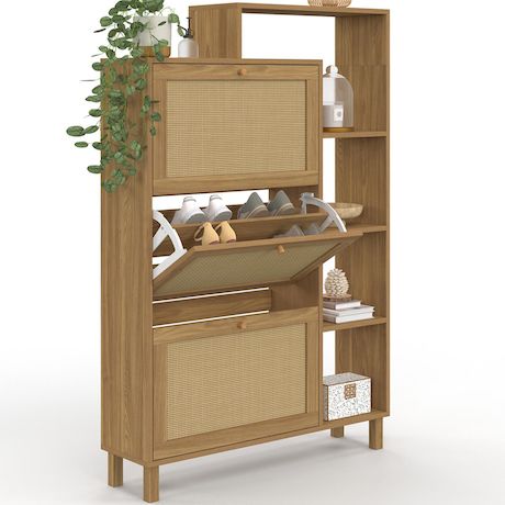 Apportez un esprit naturel et élégant à votre entrée avec ce joli meuble à chaussures cannage HANAE 3 portes et étagères. Les façades en cannage plastique apporteront une touche chaleureuse et lumineuse dans votre entrée et s'intégreront parfaitement dans tous les types d'intérieurs ! Pratiques et f