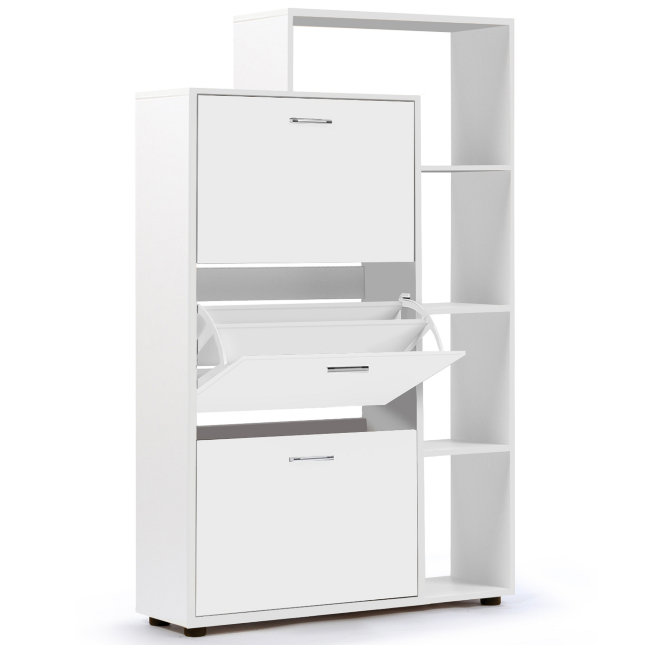 Vous cherchez un joli meuble à chaussures, vraiment pas cher et facile à monter ?Ce meuble à chaussures 3 portes avec étagère blanc ton sur ton, maxi capacité, à la couleur intemporelle, s'intègre parfaitement dans n'importe quel type d'intérieur grâce à son design épuré est fait pour vous !Ouvrez chaque casier à l'aide de la poignée finition argentée. Le mécanisme type menu déroulant vous permet de choisir rapidement la paire qu'il vous faut. Chaque espace de rangement possède une planche modulable séparant les deux rangées de paires de chaussures.Ce meuble vous offre une grande capacité de rangement, il peut contenir jusqu'à 6 paires de chaussures par espace de rangement, soit 18 paires au total = 36 chaussures, que vous pouvez organiser par rangée et trier par saison!Gain de place au sol assuré avec ce meuble conçu en hauteur! Fini les chaussures qui traînent dans l'entrée ou qui prennent la poussière !L'étagère 5 niveaux, 4 niches et 1 plateau, double la capacité de rangement. Plus besoin de chercher vos clés ou votre courrier !Vous n'avez plus qu'à y disposer une petite plante verte et des paniers de rangement pour apporter votre petite touche de décoration pour un intérieur chaleureux et personnalisé.La structure de ce meuble en panneaux de particules de bois (PB épaisseur 1,5 cm) vous garantit solidité et robustesse.Pour éviter tout risque de basculement, il est recommandé de le fixer au mur.Meuble à chaussures prévu pour des pointures allant jusqu'au 41.Dimensions du meuble pour chaussures blancDimensions totales : Longueur 90,5 cm x largeur 24 cm x Hauteur 135,5 cmDimensions du meuble à chaussures : L. 60 cm x l. 24 cm x H. 119,5 cmDimensions des tiroirs : L. 56,5 cm x l. 24 cm x H. 34,5 cmDimensions de la poignée de la porte: L. 10,5 cm x l. 2 cmÉpaisseur de la poignée de la porte : 1 cmHauteur des portes basculantes : 37 cmMeuble à chaussures prévu pour des pointures allant jusqu'au 41Modèle disponible en différents coloris sur notre boutique en ligneÀ monter soi-mêmeRetrouvez l'intégralité de nos meubles à chaussures ainsi que nos vestiaires et meubles d'entrée sur notre boutique en ligne !