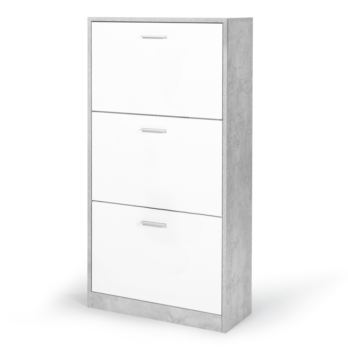 Notre meuble à chaussures effet béton 3 portes blanches vous permet de gagner de l'espace et du temps dans votre entrée !Ce meuble à chaussures s'adaptera parfaitement à votre intérieur grâce à son design fonctionnel, chic et moderne ! Il habillera tout type de couloir, tout type d'entrée.Ses 3 portes, ses 3 espaces de rangement vous permettront d'optimiser l'espace dans votre maison et ranger toutes vos chaussures.La structure de ce meuble en panneaux de particules de bois (PB épaisseur 1,5 cm) garantit stabilité et robustesse.Ouvrez chaque espace de rangement à l'aide de la poignée.Ce meuble vous offre une grande capacité de rangement car il peut contenir jusqu'à 18 paires de chaussures (6 paires par espace de rangement).Chaque espace de rangement possède une planche séparant les paires de chaussures modulables. Montage facile.Pour éviter tout risque de basculement, il est recommandé de le fixer au mur.Dimensions du meuble à chaussures effet béton 3 portes blanchesDimensions globales : Longueur 60 cm x largeur 24 cm x Hauteur 113 cmDimensions de la porte : L. 56,5 x H. 34,5 cmDimensions de l'espace de rangement : L. 56 x l. 24 x H. 34,5 cmDimensions de la poignée de la porte : L. 10,5 x l. 2 cmÉpaisseur de la poignée de la porte : 1 cmHauteur des portes basculantes : 37 cmMeuble à chaussures prévu pour des pointures allant jusqu'au 41À monter soi-mêmeModèle également disponibles dans d'autres coloris dont blanc portes béton.Retrouvez toute notre gamme de meubles à chaussures sur notre boutique en ligne ainsi que l'intégralité de notre collection béton !