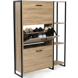 Avec sa capacité de 18 paires de chaussures, 6 paires par compartiment, toute la famille trouvera une place de rangement pour garder ses chaussures à l'abri de la poussière !Les 3 espaces de rangement sont séparés intérieurement par une cloison intermédiaire pour organiser votre dressing à chaussures. Le format abattant des portes, gain de place et astucieux, permet une ouverture facilitée.Les jolies poignées intégrées ainsi que la structure en métal noir apportent design, robustesse et stabilité au meuble. Le meuble à chaussure LUIS est composé d'une étagère avec 4 plateaux.Pratique et fonctionnelle, vous pourrez disposer sur cette étagère des petites plantes, un cadre, ou autres objets de décoration.Bi matière bois imitation hêtre/métal, ses coloris naturels chaleureux feront de votre vestibule un espace accueillant et bien rangé ! Un look industriel sobre pour une entrée ultra nette ! Ses finitions soignées vous donnent la possibilité de le ranger dans une buanderie, un dressing, ou même une entrée !Vous n'avez plus qu'a poser de jolis objets décoratifs ou de petites plantes vertes sur l'étagère du meuble.Combinez les par 1, par 2 ou par 3 selon vos besoins !Ultra plat, avec sa profondeur de 24 cm et son design tout en hauteur, il vous fera gagner de la place et n'encombrera pas votre pièce ! Son format légèrement surélevé est idéal pour nettoyer sous le dessous du meuble.Ne laissez plus traîner vos paires de chaussures et gardez-les à l'abri des regards derrière ce meuble de rangement moderne et discret !Pratique et en plein dans la tendance du moment !A fixer au mur pour éviter tout risque de basculement.Dimensions du meuble chaussures LUIS avec étagèreDimensions globales hors tout : Longueur 92 cm x Largeur 24 cm x Hauteur 117 cmHauteur de la porte : 35 cmHauteur des pieds : 8 cmMeuble à chaussures prévu pour des pointures allant jusqu'au 41À monter soi-même