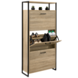 Avec sa capacité de 18 paires de chaussures, 6 paires par compartiment, toute la famille trouvera une place de rangement pour garder ses chaussures à l'abri de la poussière ! Les 3 espaces de rangement sont séparés intérieurement par une cloison intermédiaire pour organiser votre dressing à chaussures.Le format abattant des portes, gain de place et astucieux, permet une ouverture facilitée.Les jolies poignées intégrées ainsi que la structure en métal noir apportent design, robustesse et stabilité au meuble.Bi matière bois imitation hêtre/métal, ses coloris naturels chaleureux feront de votre vestibule un espace accueillant et bien rangé ! Un look industriel sobre pour une entrée ultra nette !Son étagère supérieure d'une hauteur de 13 cm est idéale pour exposer vos bibelots, bougie, vide-poche. Vous n'avez plus qu'a poser de jolis objets décoratifs ou de petites plantes vertes sur le dessus du meuble.Ses finitions soignées vous donnent la possibilité de le ranger dans une buanderie, un dressing, ou même une entrée ! Combinez les par 1, par 2 ou par 3 selon vos besoins !Ultra plat, avec sa profondeur de 23,5 cm et son design tout en hauteur, il vous fera gagner de la place et n'encombrera pas votre pièce !Son format légèrement surélevé est idéal pour nettoyer sous le dessous du meuble.Ne laissez plus traîner vos paires de chaussures et gardez-les à l'abri des regards derrière ce meuble de rangement moderne et discret !Pratique et en plein dans la tendance du moment !A fixer au mur pour éviter tout risque de basculement.Dimensions du meuble chaussures LUIS design industrielDimensions globales : Longueur 63,2 x largeur 23,5 x Hauteur 131,5 cmHauteur de l'étagère : 13 cmHauteur des portes basculantes : 35 cmHauteur des pieds : 5 cmMeuble à chaussures prévu pour des pointures allant jusqu'au 41À monter soi mêmeRetrouvez l'ensemble de nos meubles à chaussures sur notre site en ligne ! Et notre collection design industrielle pour meubler joliment votre intérieur.