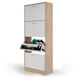 Vous cherchez un joli meuble à étagères à chaussures, vraiment pas cher et facile à monter ? Ce meuble à chaussures est votre solution !Ce meuble à chaussures imitation hêtre portes blanches maxi capacité à la couleur naturelle s'intègre parfaitement dans n'importe quel type d'intérieur grâce à son design épuré.Ouvrez chaque casier à l'aide de la poignée finition argentée. Le mécanisme type menu déroulant vous permet de choisir rapidement la paire qu'il vous faut. Chaque espace de rangement possède une planche modulable séparant les deux rangées de paires de chaussures. Ce meuble vous offre une grande capacité de rangement, il peut contenir jusqu'à 6 paires par espace de rangement, soit 24 paires au total = 48 chaussures, que vous pouvez organiser par rangée et trier par saison! Chaque espace de rangement possède une planche modulable séparant les deux rangées de paires de chaussures. La structure de ce meuble en panneaux de particules de bois (PB épaisseur 1,5 cm) vous garantit solidité et robustesse.Gain de place au sol assuré avec ce meuble conçu en hauteur! Fini les chaussures qui traînent dans l'entrée ou qui prennent la poussière !Pour éviter tout risque de basculement, il est recommandé de le fixer au mur. Dimensions du meuble à chaussures imitation hêtre 4 portes blanchesDimensions globales : Longueur 60 cm x largeur 24 cm x Hauteur 150 cmDimensions de la porte : L. 56,5 x H. 34,5 cmDimensions de l'espace de rangement : L. 56,5 cm x l. 24 x H. 34,5 cmDimensions de la poignée de la porte : L. 10,5 x l. 2 cm Épaisseur de la poignée de la porte : 1 cmHauteur des portes basculantes : 37 cmMeuble à chaussures prévu pour des pointures allant jusqu'au 41À monter soi-mêmeModèle disponible en différents coloris sur notre boutique en ligne :– Meuble à chaussures 4 portes blanc– Meuble à chaussures blanc 4 portes gris clair– Meuble à chaussures blanc 4 portes gris foncé– Meuble à chaussures imitation hêtre 4 portes noiresRetrouvez toute notre gamme de meubles à chaussures sur notre boutique en ligne !