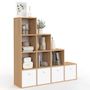 Découvrez un meuble de rangement élégant et fonctionnel en escalier bois et blanc qui s'intégrera à merveille dans votre chambre, bureau ou salon.Ce meuble cases offre de nombreuses possibilités de rangement, grâce à ses 10 casiers répartis sur 4 niveaux. Choisissez d'exposer vos objets de déco, vos livres, vos CD dans les cases ouvertes ou de ranger vos documents importants en toute discrétion dans les 4 tiroirs en tissus amovibles.Avec un design moderne et épuré, le meuble de rangement en escalier LORYS est le meuble parfait pour votre intérieur.Grâce à sa forme en dégradé, le meuble en escalier est idéal pour créer une séparation artificielle entre différents espaces d'une même pièce.Ainsi ce meuble trouvera aussi bien sa place dans un studio, faisant office de cloison pour séparer le coin nuit de l'espace de travail, par exemple, que dans un grand espace.Alors n'hésitez plus et craquez pour ce meuble de rangement bois et blanc à petit prix qui saura répondre à tous vos besoins !Dimensions du meuble de rangement en escalier LORYS bois et blancDimensions globales : Longueur 117 cm x largeur 30 cm x Hauteur 117 cmDimensions d'une case : L. 27,7 x l. 30 x H. 27,7 cmDimensions d'un tiroir tissu : L. 27 x l. 29 cm x H. 27,5 cmMatériaux : particules de bois (PB)Coloris : bois et blancÀ monter soi-mêmeDécouvrez l'ensemble de notre collection moderne sur notre site internet !