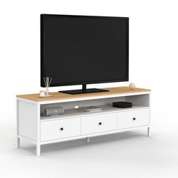 Meuble TV 140 cm ACHILLE 3 tiroirs blanc et plateau bois