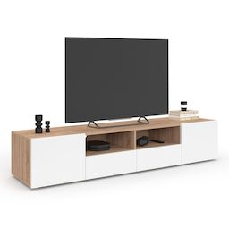 Elément de rangement et de décoration, esthétique et fonctionnel avec son plateau d'une longueur idéale de 180 cm, il s'intégrera parfaitement dans votre salon !Le meuble télé ELI est muni de deux placards fermés ainsi que de deux abattants pour ranger vos livres ou effets plus personnels en toute discrétion. Ses 2 niches ouvertes seront parfaites pour vos télécommandes, vos lecteurs DVD, votre box et pour vos petits objets de décoration.Grâce à son coloris bois et blanc, ce meuble TV apportera une touche de modernité à votre intérieur ! Robuste, ne craignez pas d'y poser votre télévision et vos consoles de jeux puisqu'il est doté d'une structure en panneaux de particules de bois solide et d'un piétement stable.Deux trous passe-câbles déjà percés et facilement accessibles vous permettent d'installer tout votre matériel hi-fi et vidéo en un tour de main.Le meuble TV ELI 180 cm à la grande capacité de rangement offre de bonnes soirées télé en perspective, en famille ou entre amis !Multifonction, meuble de rangement, meuble TV, meuble de décoration... il a tout pour plaire ! N'hésitez plus et craquez pour ce meuble TV 180 cm bois et blanc pour apporter une touche design à votre intérieur. Dimensions du meuble TV 180 cm portes façon hêtreDimensions globales : Longueur 180 cm x largeur 35 cm x Hauteur 31,5 cmDimensions des portes : L. 45 x l. 33 x H. 30 cmDimensions des abattants : L. 45 cm x l. 33 cm x H. 13 cm Dimensions des niches : L. 45 x l. 33 x H. 12,5 cmHauteur des pieds : 1 cmMatériaux : panneaux de particules de bois (PB) À monter soi-mêmeColoris : bois et blancRetrouvez également l'ensemble de nos meubles contemporains sur notre boutique en ligne !