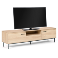 Pour accueillir votre grand écran télé, optez pour le meuble TV SEATTLE bi-matière en bois et métal au look contemporain et design !Ce meuble TV aux lignes épurées s'intégrera facilement à tous les styles de décoration grâce à son coloris bois neutre passe-partout et tendance. Son piètement fin en métal noir souligne son design et lui donne une allure très aérienne.Doté d'un plateau de 180 cm de longueur, il pourra accueillir de grands écrans télé et mettra en valeur l'espace de votre pièce de par ses proportions généreuses.Ultra fonctionnel, le meuble est équipé d'une niche ouverte qui sera parfaite pour votre box ! En effet, grâce à son trou passe-câbles situé à l'arrière du meuble, plus besoin de perceuse pour dissimuler les fils !En plus, ses 3 rangements fermés dont un placard central avec abattant vous offrent la possibilité de ranger en toute discrétion console de jeu, DVD, Blu-ray et magazines à proximité direct de votre télé !La structure en panneaux de particules de bois et le piétement en métal du meuble TV lui assurent stabilité et robustesse, pour un usage au quotidien ! Les poignées noires fines participent au design du meuble et rendent l'ouverture des placards aisée.Optez pour le design contemporain pratique avec ce meuble TV XXL SEATTLE avec rangements !Dimensions du meuble TV SEATTLE contemporainDimensions globales : Longueur 180 cm x largeur 39 cm x Hauteur 47,5 cmHauteur des pieds : 15 cmDimensions des grandes portes : L. 59,2 cm x H. 26,5 cmDimensions intérieures des grands placards : L. 57,5 x l. 39 x H. 26 cmDimensions de la niche centrale : L. 57 x l. 37 x H. 14 cmDimensions intérieures du placard central : L. 57 x l. 35 x H. 14.5 cmLongueur des poignées en métal : 15 cmMatériaux : panneaux de particules 1,5 cm et métal 1,6 x 1,6 cmColoris : bois et piètement noirTrou passe câble à l'arrière du meubleÀ monter soi-mêmeDécouvrez l'ensemble de notre collection contemporaine sur notre boutique en ligne !
