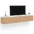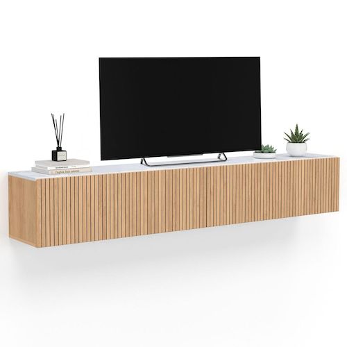 Meuble TV 180 cm suspendu JULIETTE plateau effet marbre lattes tasseau bois coloris chêne