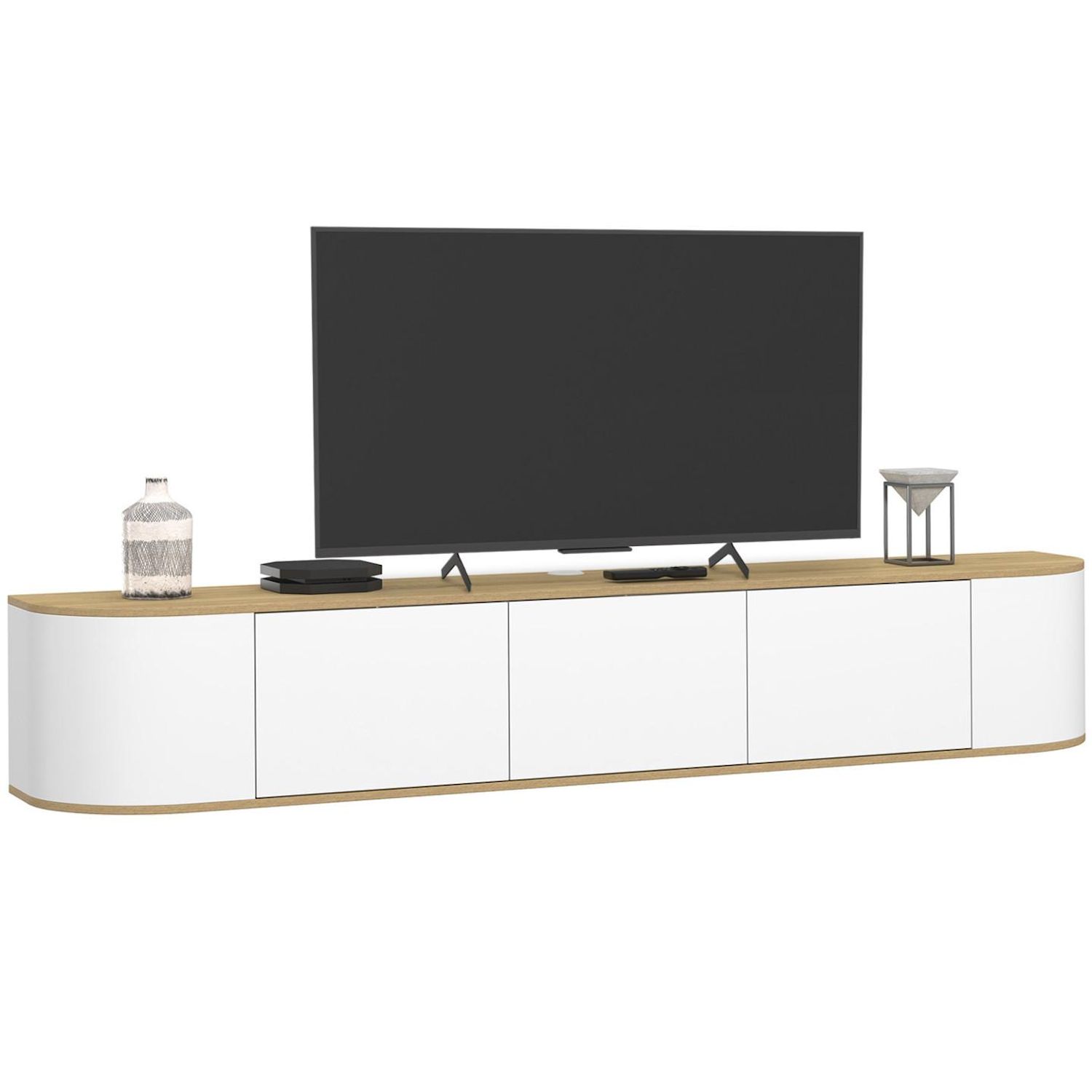 Meuble TV 180 cm suspendu LEORA 3 portes bois et blanc