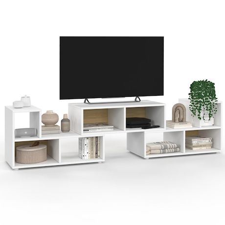 Le meuble TV LEONARD est une véritable pièce maîtresse pour tous ceux qui recherchent à la fois design, modularité et praticité.Pensé pour s'adapter à toutes les configurations d'intérieur, ce meuble multifonction vous permet de créer un espace qui évolue selon vos envies et vos besoins. Avec ses lignes épurées et sa finition blanche relevée par un délicat fond en bois clair, il s'intègre parfaitement dans tous les styles de décoration, du plus contemporain au plus scandinave.Ce meuble ingénieux se compose de trois modules indépendants, dont deux en forme d'escalier et un module rectangulaire. Grâce à cette conception modulaire, le meuble LEONARD peut être utilisé de multiples manières : en meuble TV altique, en étagère décorative ou encore en séparateur de pièce élégant. Sa structure pivotante à 180° offre une grande liberté d'aménagement et permet d'ajuster la longueur totale entre 140 et 205 cm. Vous pouvez ainsi le disposer le long d'un mur pour accueillir votre téléviseur et vos équipements multimédias, ou bien le positionner au centre d'une pièce pour délimiter subtilement les espaces sans les cloisonner.Au-delà de son esthétisme, le meuble LEONARD séduit par sa fonctionnalité. Ses niches ouvertes offrent de vastes espaces de rangement pour vos livres, objets décoratifs, paniers ou accessoires audiovisuels. Sa conception ouverte laisse circuler la lumière et permet de conserver une impression d'espace et de légèreté, même dans les intérieurs les plus compacts. Les fonds en bois clair, amovibles selon vos préférences, permettent de personnaliser le rendu : avec eux, vous obtenez un contraste doux et chaleureux , sans eux, vous optez pour une allure 100 % blanche et minimaliste.Fabriqué en panneaux de particules mélaminés, le meuble TV LEONARD garantit robustesse et stabilité dans le temps. Sa surface lisse se nettoie facilement avec un simple chiffon humide, ce qui en fait un meuble aussi esthétique que pratique au quotidien. Le meuble TV 3 modules LEONARD est bien plus qu'un simple mobilier : c'est une solution modulable, personnalisable et intemporelle qui réinvente votre façon d'aménager l'espace. Dimensions du meuble TV modulable LEONARDDimensions globales : L. 140-205 x l. 30 x H. 43-44,5 cmDimensions des modules en forme de L : L. 70 x l. 30 x H. 43 cmDimensions du module rectangulaire : L. 70 x l. 30 x H. 21,5 cmHauteur des pieds : 1,5 cm4 fonds amovibles / 8 pieds amovibles8 compartiments de rangementsMatériaux : Panneaux de particules Coloris : Blanc et boisÀ monter soi-mêmeRetrouvez l'ensemble de nos meubles TV sur notre boutique en ligne !