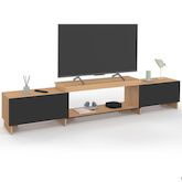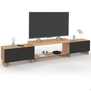 Apportez une touche de modernité et de praticité à votre intérieur avec ce meuble TV VLAD extensible de 140 à 240 cm.Grâce à son look bicolore bois et noir, il s'intègre parfaitement dans un salon moderne, scandinave ou industriel.Son plateau extensible de 140 à 240 cm vous permet d'ajuster la longueur en fonction de vos besoins, idéal pour les petits comme pour les grands espaces.Équipé d'une niche ouverte au centre pour vos appareils multimédia et de deux abattants fermés pour dissimuler vos accessoires, ce grand meuble TV allie rangement discret et accessibilité.Conçu en panneaux de particules coloris bois avec des finitions noires élégantes, il combine robustesse et design contemporain.Pratique, esthétique et modulable, c'est le choix idéal pour organiser votre coin TV tout en mettant en valeur votre décoration intérieure.Alors n'hésitez plus et craquer pour ce meuble TV bois et noir extensible VLAD 140-240 cm à prix mini !Dimensions du meuble TV extensible VLADDimensions globales meuble TV ouvert : Longueur 240 cm x largeur 35,5 cm x Hauteur 46,5 cmDimensions globales meuble TV fermé : Longueur 140 cm x largeur 35,5 cm x Hauteur 46,5 cmDimensions de la partie supérieure fixe : L. 110 x l. 34 x H. 46,5 cmDimensions de la partie étagère modulable au centre : L. 0-100 x l. 34 x H. 30 cmDimensions d'un placard à abattant : L. 70 x l. 35,5 x H. 40 cmDimensions intérieures d'un placard à abattant : L. 67 x l. 34,5 x H. 27 cmDimensions d'une porte abattante : L. 70 x H. 29,5 cmHauteur des pieds : 10 cm2 trous passe câbles Matériaux : panneaux de particules (PB) Coloris : bois et noirÀ monter soi-mêmeDécouvrez l'intégralité de notre collection moderne disponible sur notre boutique en ligne.