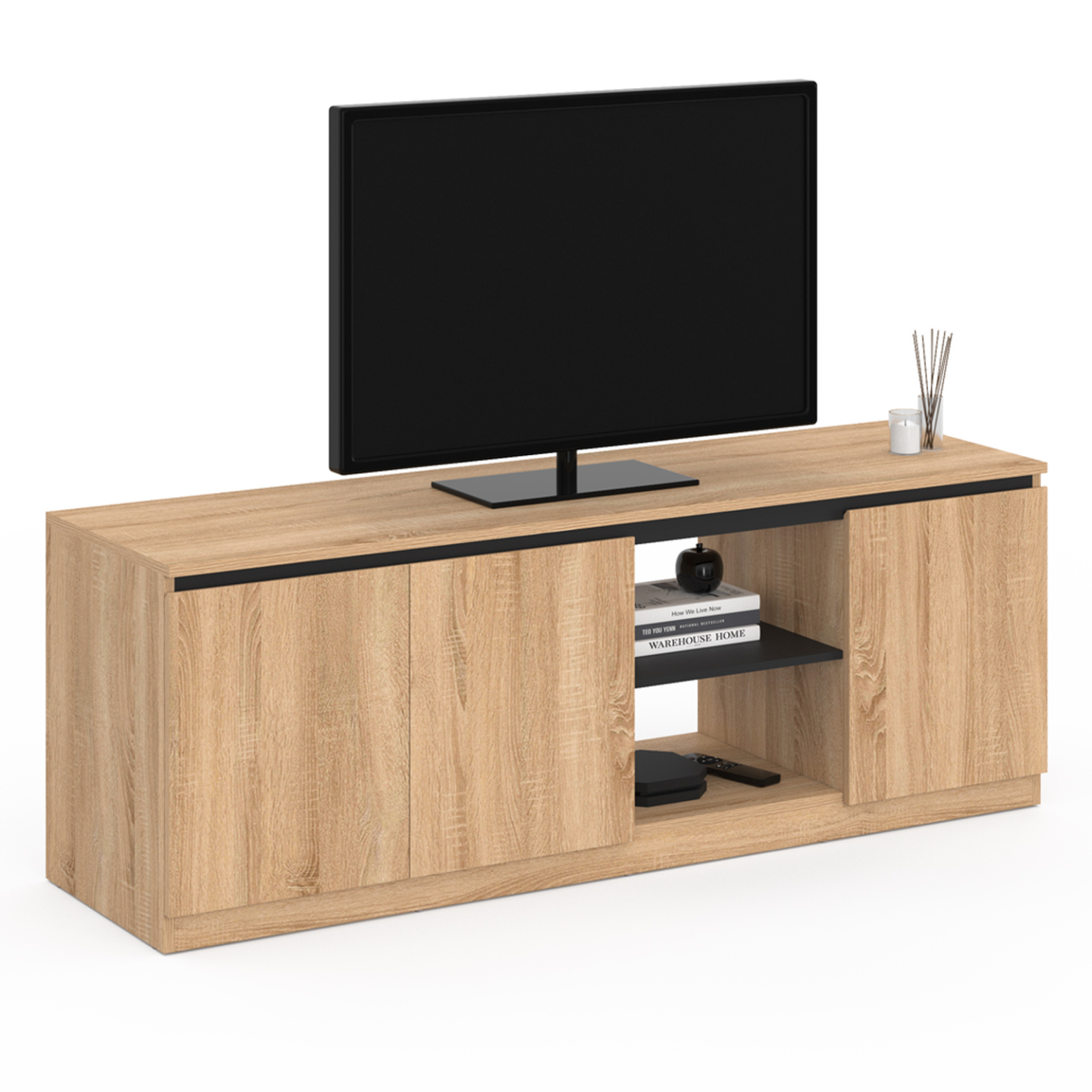 Pour accueillir votre télévision, optez pour le meuble TV TOMI façon hêtre et son liseré noir au style moderne pour apporter une note chaleureuse à votre salon.Ce meuble TV s'intégrera parfaitement à tous les types d'intérieurs avec son coloris hêtre naturel relevé par cette bande supérieure noire design qui apportera du cachet à votre pièce.Son plateau effet hêtre de 140 cm de long sera idéal pouvoir accueillir votre écran TV et pourquoi pas quelques décorations. Ultra fonctionnel, ce meuble dispose de plusieurs rangements : 3 placards fermés avec trous passe câbles très pratiques afin de passer discrètement vos fils derrière et 2 niches centrales pour pouvoir mettre votre box et même votre console. De plus, sa structure en particules de bois lui confère stabilité et robustesse !Optez pour une solution tendance et astucieuse en choisissant le meuble TV TOMI 140 cm et craquez pour son prix attractif !Dimension du meuble TV TOMI 3 portes 140 cmDimensions globales : Longueur 140 cm x largeur 40 cm x Hauteur 50 cmDimensions d'une porte : L. 34,1 x H. 41,5 cmDimensions du grand placard : L. 67 x l. 37 x H. 38,5 cmDimensions du petit placard : L. 32 x l. 37 x H. 38,5 cmDimensions des niches : L. 35 x l. 38 x H. 18,5 cm1 trou passe-câble dans chaque placardMatériaux : Panneaux de particulesColoris : Bois et noirRetrouverez l'ensemble de la collection contemporaine sur notre boutique en ligne !