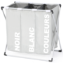 Descriptif du panier à linge 3 compartiments Esthétique, avec sa jolie couleur gris perle discrète, et ses inscriptions modernes blanches, elle s'intégrera parfaitement dans votre salle de bains, chambre ou buanderie.Ses dimensions compactes en font un accessoire peu encombrant qui vous fera gagner de l'espace. Fini le linge sale qui traîne, la chaussette oubliée !Suivez les inscriptions pour pratiquer un tri par couleur, par type de linge ou par membre de la famille, comme bon vous semble, selon vos besoins et quantité de linge.La structure en aluminium du coffre à linge triple lui assure stabilité et solidité une fois le sac en tissu souple rempli.Des connecteurs plastique permettent au panier à linge de se replier sur lui même lorsque vous souhaitez le ranger pour libérer de l'espace une fois les machines terminées, ou le transporter pour libérer de l'espace. 2 sangles ultra pratiques et résistantes facilitent le transport de ce bac à linge léger.Fermez les différents sacs grâce à des filets à fermeture par cordon faisant office de couvercle une fois le linge de votre lavage prêt, leur système d'aération évitera les mauvaises odeurs et l'humidité.La lessive ne sera plus une corvée mais un plaisir, vous n'aurez plus à trier le linge une fois le moment du lavage venu ! Chaque membre de la famille peut ranger le linge sale au fur et à mesure dans le bac prévu à cet effet, et vous faire gagner du temps, ingénieux!Et idéal pour sensibiliser votre enfant ou ado aux tâches ménagères quotidiennes et installer des automatismes !Gardez votre maison propre et bien rangée avec le bac à linge triple ludique !Dimensions du panier à linge 3 compartimentsDimensions globales : Longueur 60 cm x largeur 36 cm x Hauteur 58 cmDimension sac : L. 19 x l. 53 x H. 30 cmMatériaux : Sacs polyester, barres en aluminium, connecteur en plastiqueEpaisseur de la structure aluminium : L. 0,6 x l. 2 x P. 1 cmColoris : gris et blanc2 sangles pour faciliter le transportCouvercle en filet à fermeture par cordonÀ monter soi-mêmeRetrouvez également l'ensemble de nos accessoires de salle de bain sur notre boutique en ligne !