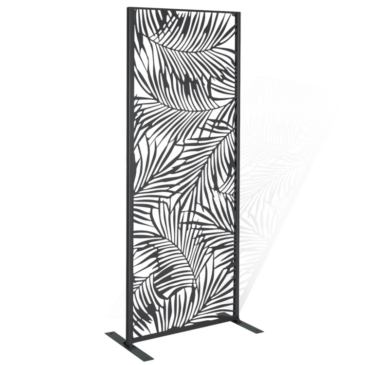 Apportez une touche déco à votre extérieur grâce à ce panneau en métal ajouré. Son design ultra moderne habillera votre terrasse ou votre mur avec élégance. Fabriqué en métal ajouré, le panneau universel PALM est résistant aux intempéries et ne demande aucun entretien. Vous n'aurez pas à vous souciez de sa longévité.Conçu pour s'adapter à votre environnement extérieur, ce panneau, en plus d'être stable, vous propose 4 modes de fixation : choisissez de le fixer directement au sol de votre terrasse ou sur votre pelouse ou au contraire, accrochez-le à votre mur ! Vous disposez d'un panneau en bois composite ? Vous pouvez également insérer le panneau PALM entre vos planches. Résistant et durable, vous pourrez longuement profiter du design du panneau décoratif universel. Ses formes tropicales ajourées sont ultra modernes et apportent une note tendance à votre extérieur ! Notre astuce : faîtes grimper vos plantes le long du panneau PALM pour un effet végétal garanti ! Dimensions du panneau décoratif PALM- Dimensions totales : largeur 50 CM x Hauteur 150 CM x épaisseur 1,8 CM- Dimensions des pieds : Longueur 40 CM x largeur 5 CM x Hauteur 4 MM- Épaisseur de la structure : 18 x 18 x 1 MM- Épaisseur du métal : 0,8 x 1,8 MM- Peinture spray- Couleur : gris 425CCe modèle convient aux panneaux occultants disposant d'une épaisseur de lame de 1,8 CM.Découvrez nos autres panneaux occultants sur notre boutique en ligne !