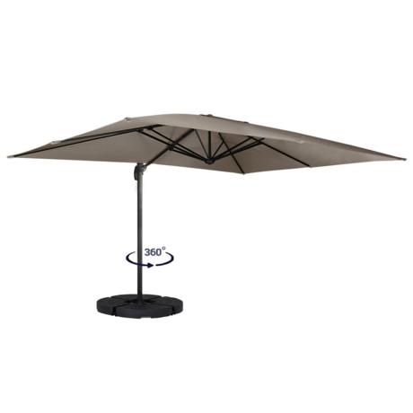 Parasol déporté inclinable rotatif 360 CALVI taupe 3x4 M avec 4 dalles et housse