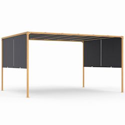 Vous avez une jolie terrasse, un beau salon de jardin mais pas encore d'ombrage. Ne cherchez plus la solution, elle est sous vos yeux ! La pergola acier et ses deux toiles coulissantes au design épuré est la solution idéale pour apporter la touche finale à votre extérieur. Avec son design à la fois chic, moderne et épuré, la structure effet bois comme les toiles grises de votre pergola s'accorderont parfaitement avec vos éléments extérieurs. La structure de la pergola se fixe au sol grâce à ses quatre pieds de 5x5 cm. Chaque pied est relié par des traverses de 25x50mm, de quoi stabiliser votre pergola et lui offrir une bonne résistance aux intempéries. Outre son esthétisme, cette pergola 3x4 M, vous permet grâce à ses deux pans de créer votre propre espace d'ombrage personnalisable ! Il vous suffit de tirer la toile d'un côté ou de l'autre de la structure et ainsi de profiter d'un peu de fraîcheur. En tirant vos toiles, vous vous créez un espace cocoon et douillet où il fait bon se reposer et profiter de son jardin. Chacune toile mesure 5,84 m de long par 1,42 m de large, idéal pour recouvrir totalement l'une des parties de votre pergola !La structure effet bois de la pergola avec sa toile grise vous offre la possibilité d'exprimer votre créativité grâce à tout votre mobilier extérieur ! En effet, toutes les couleurs s'accordent avec le gris, vous voilà certain de ne pas faire d'erreur. Choisissez la polyvalence et la modernité, protégez-vous du soleil comme des très faibles pluies. Vous venez de trouver la pièce manquante à votre terrasse, il ne vous reste plus qu'à en profiter.Nous vous conseillons en cas d'intempéries (pluie et vent) de retirer la toile de sa structure afin de prévenir le risque de stagnation d'eau. Veillez également à bien fixer la pergola au sol afin d'assurer une bonne stabilité.Dimensions de la pergola 3x4 M effet bois et toile grise coulissanteDimensions hors tout : Longueur 300 cm x largeur 400 cm x Hauteur 220 cmDensité/Grammage : Toile en polyester 160 gr/m²Dimensions des pieds : 5 x 5 x 220 cmDimensions des traverses : 50 x 25 mmDistance entre les pieds : 285 / 385 cmMatériaux : Structure en acier, toile en polyesterColoris : Structure effet bois, toile griseÀ monter soi-même Retrouvez également l'ensemble de nos pergolas sur notre boutique en ligne !